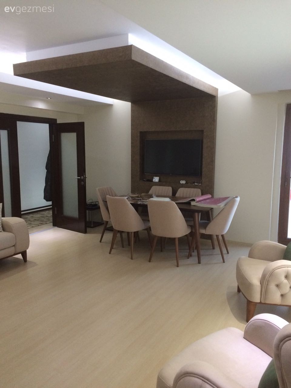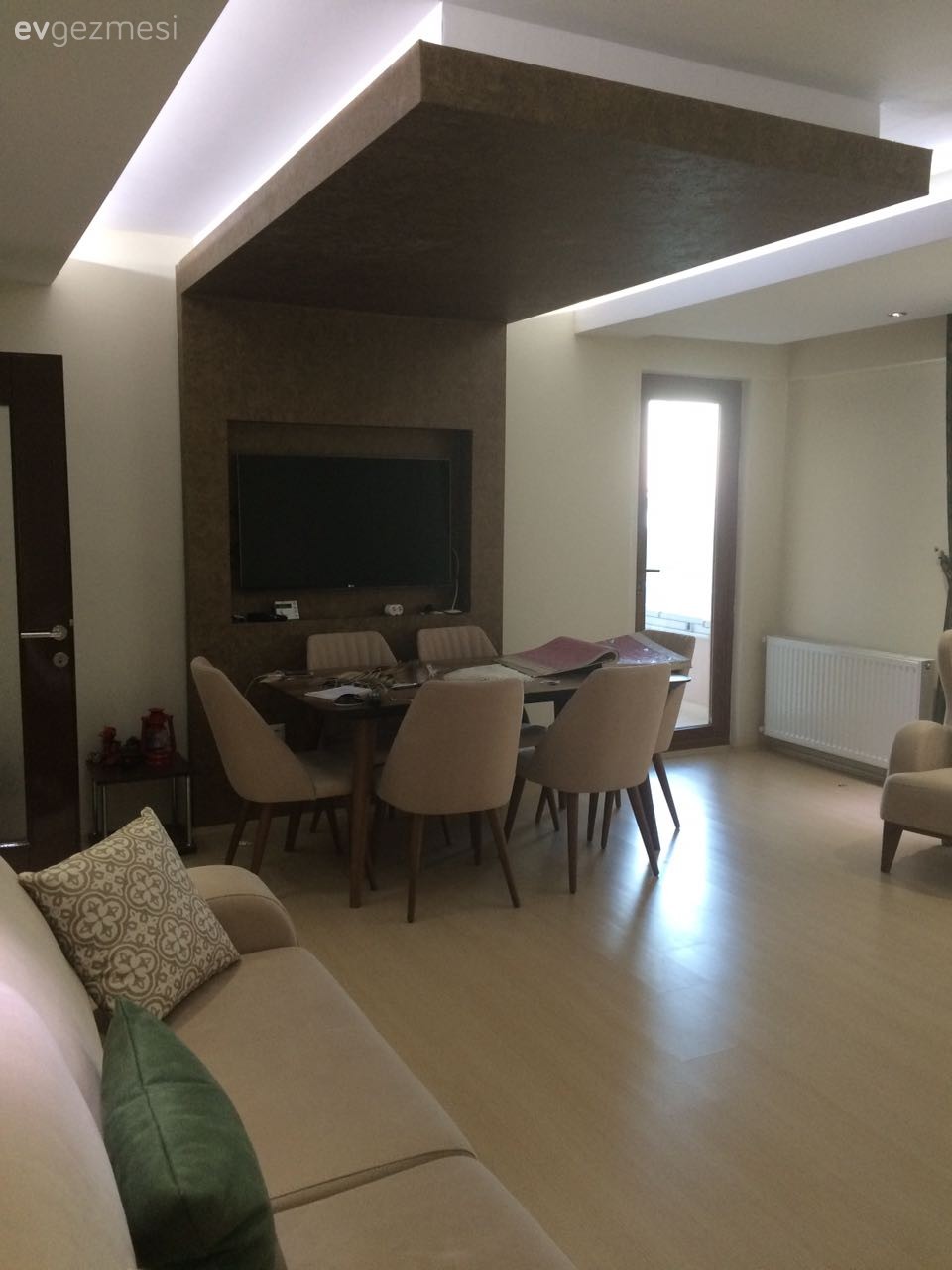 koyu kahve mobilya kullanmışsınız etrafına açık renkli bir duvar kağıdı tercih etmeniz gerekir diye düşünüyorum. Açık renkli patlatma taş kaplamada yaptırabilirsiniz..