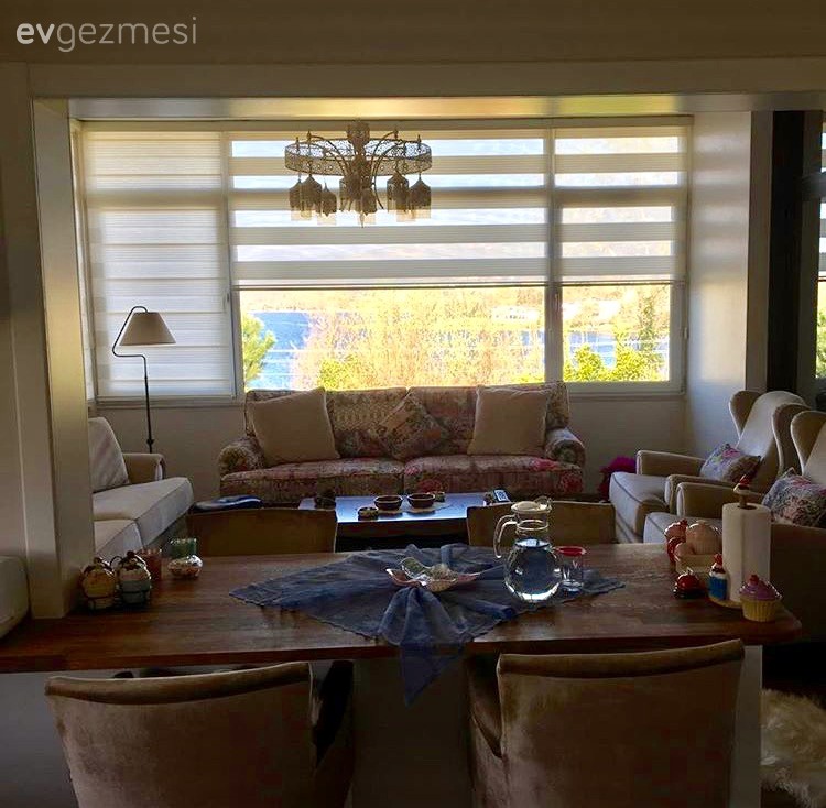 Tüllerinizin üzerine çok yumuşak pastel tonlarda yeşil ve eflatun tek taraflı kruvaze tül fon, koltuklarınıza da aynı tonlarda kırlent yaptırabilirsiniz, halınızı kırık beyaz üzerine çok baskın şekilde olmamak kaydıyla kahverengi,toprak rengi , koltuk renginiz ve yine eflatun tonlarda çok hafif hareli desenlerle süslü bir halıyla kombinleyebilirsiniz ve sandalyelerinizi koltuk renginizden bir iki ton daha koyu renkle kaplatabilirsiniz , kolay gelsin