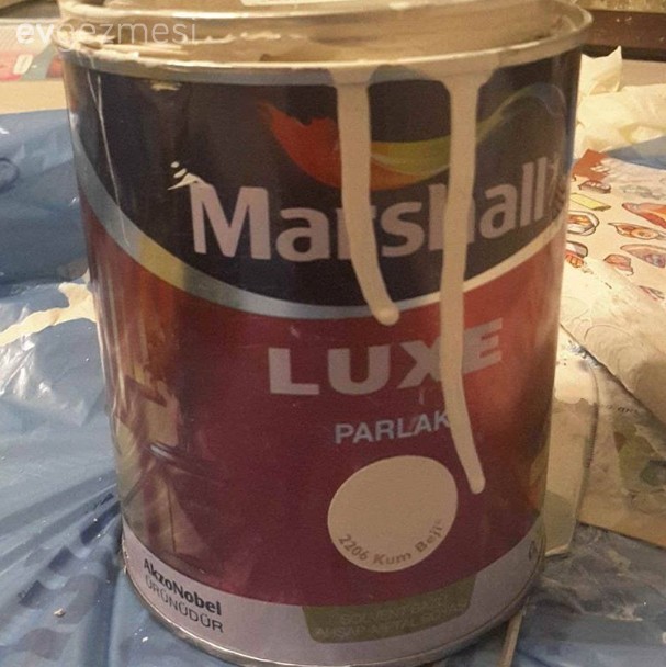 Zımpara yapmadan, Marshall Luxe Parlak Kumbeji boya ve havlu rulo fırça yardımı ile 4 kat boyanmış. Boya tinerle inceltilen bir boyadır.
