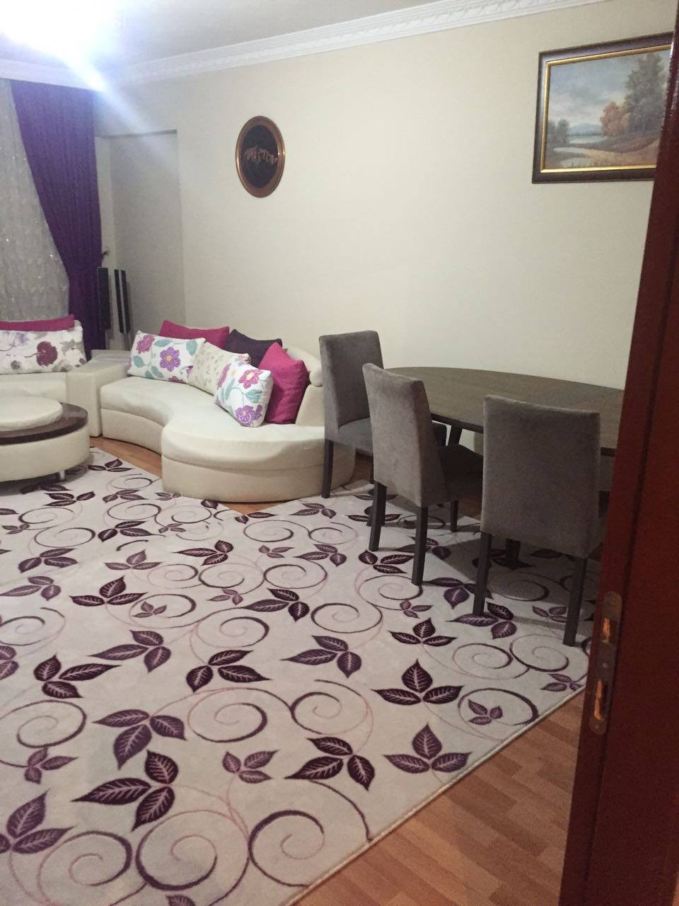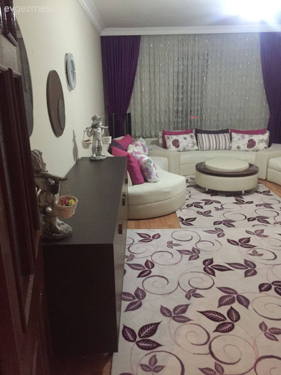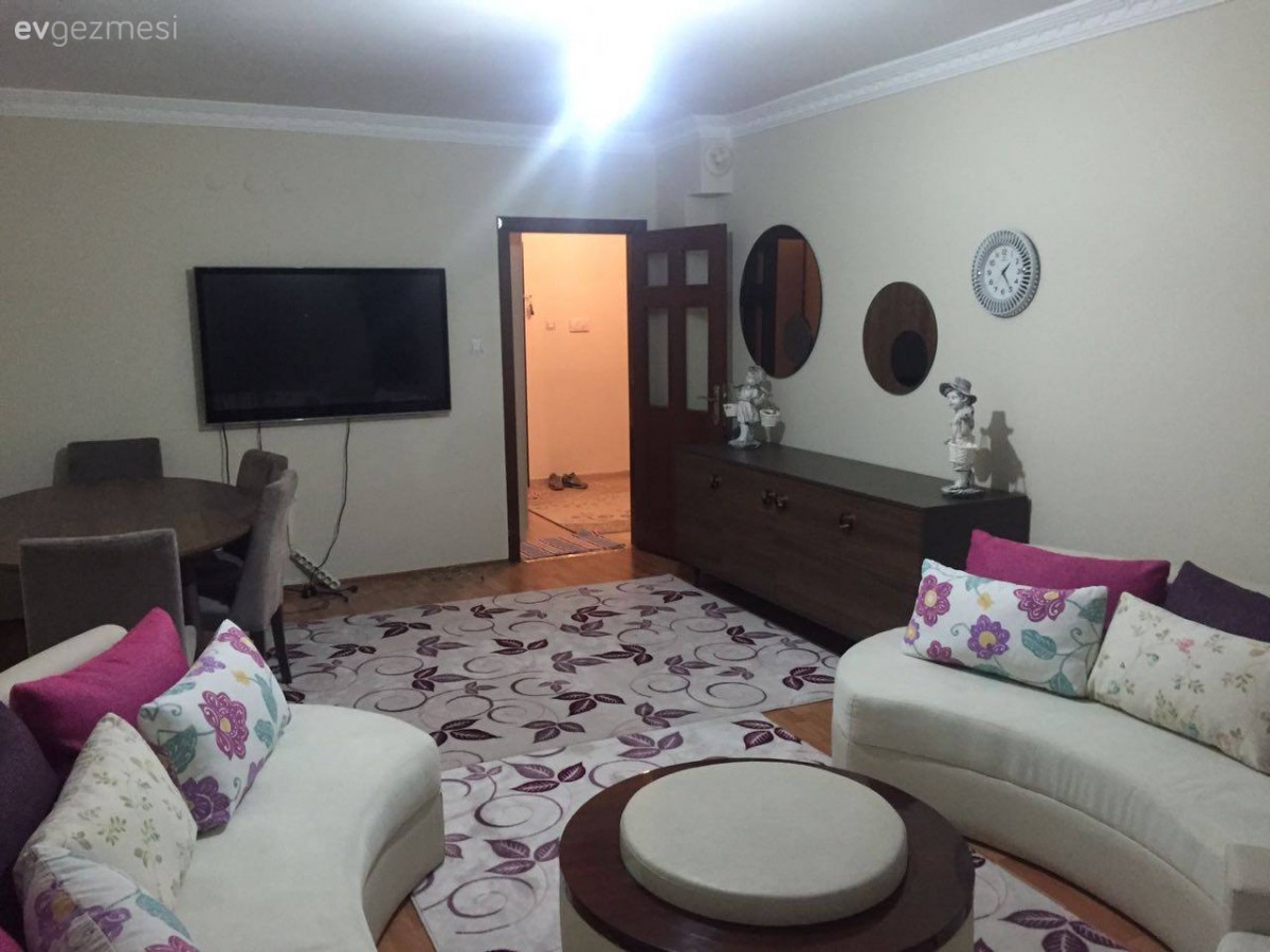 bence o konsol da tv nin altında olmalı zaten ayna duvarda onüne masa olmalı ve o halılar oraya olmamıs ...oval kesim sacaklı tek bir krem rengi halı odayı da geniş gösterecek tir..o koltukların uzerinde ki çiçekli yastıklar fazlalık göz yoruyor ...sadece fusya ve morlar kalabilir birde o koltuklar ayrılıyorsa birbirinden biraz uzaklastırın bence...