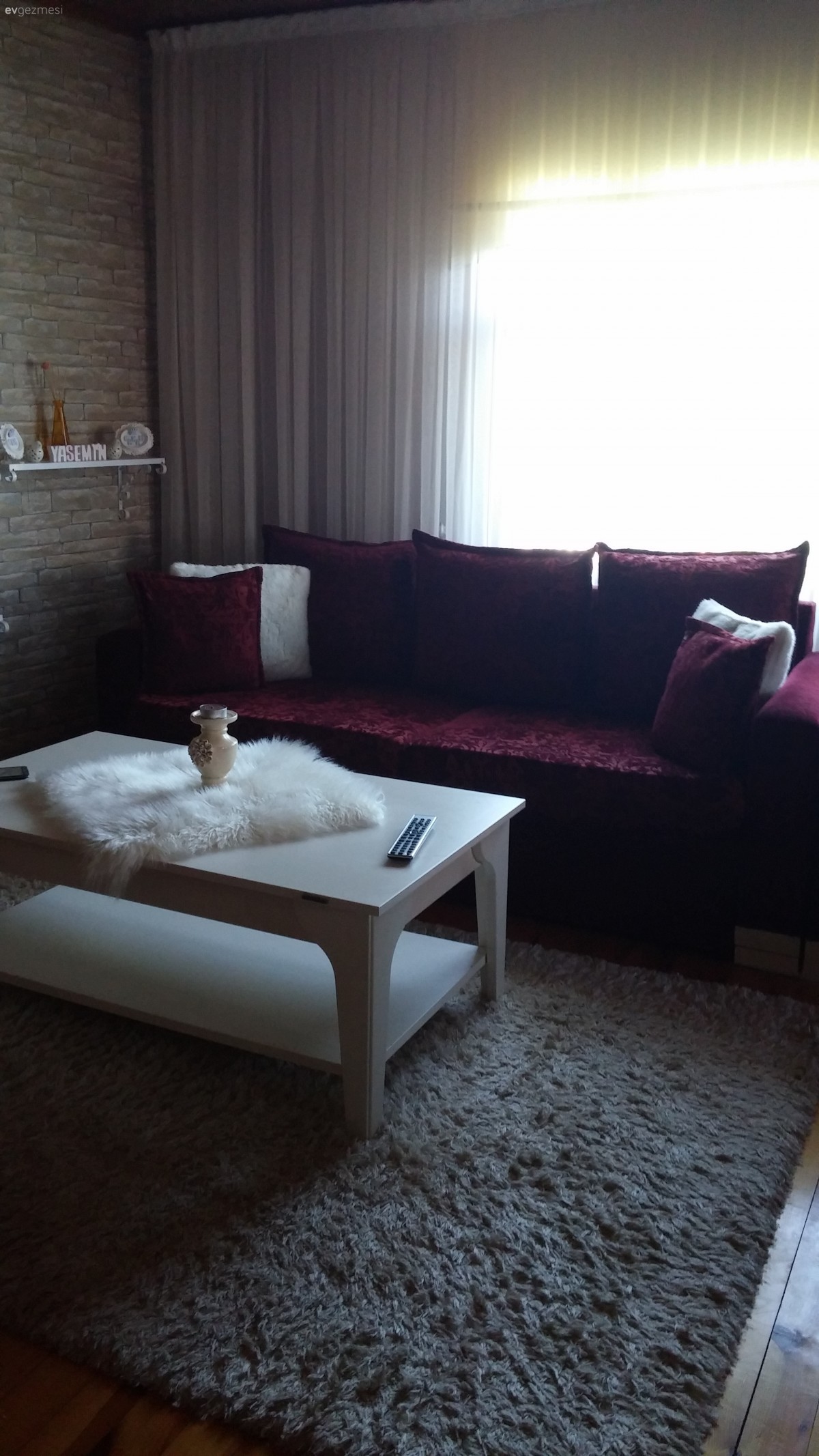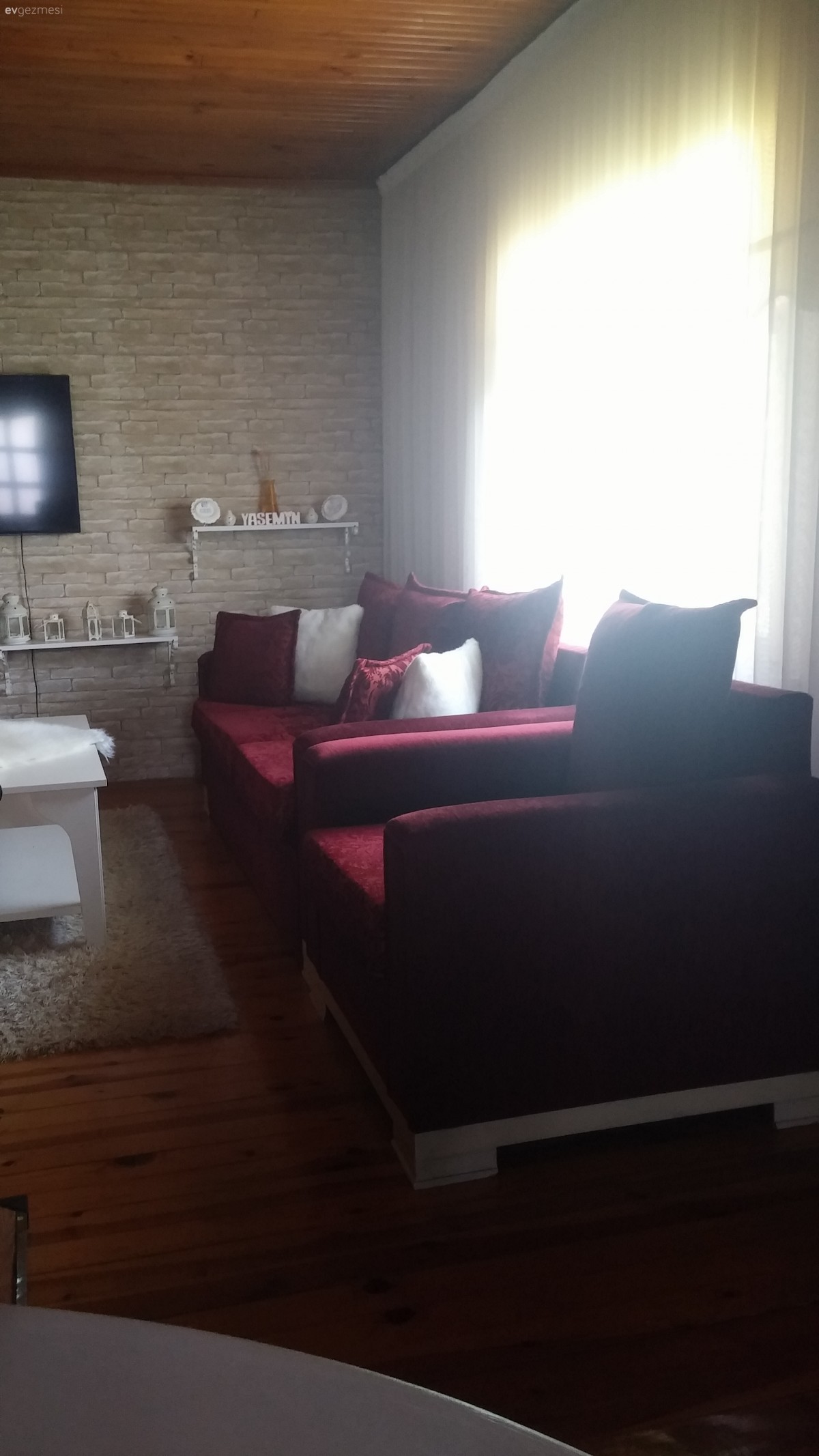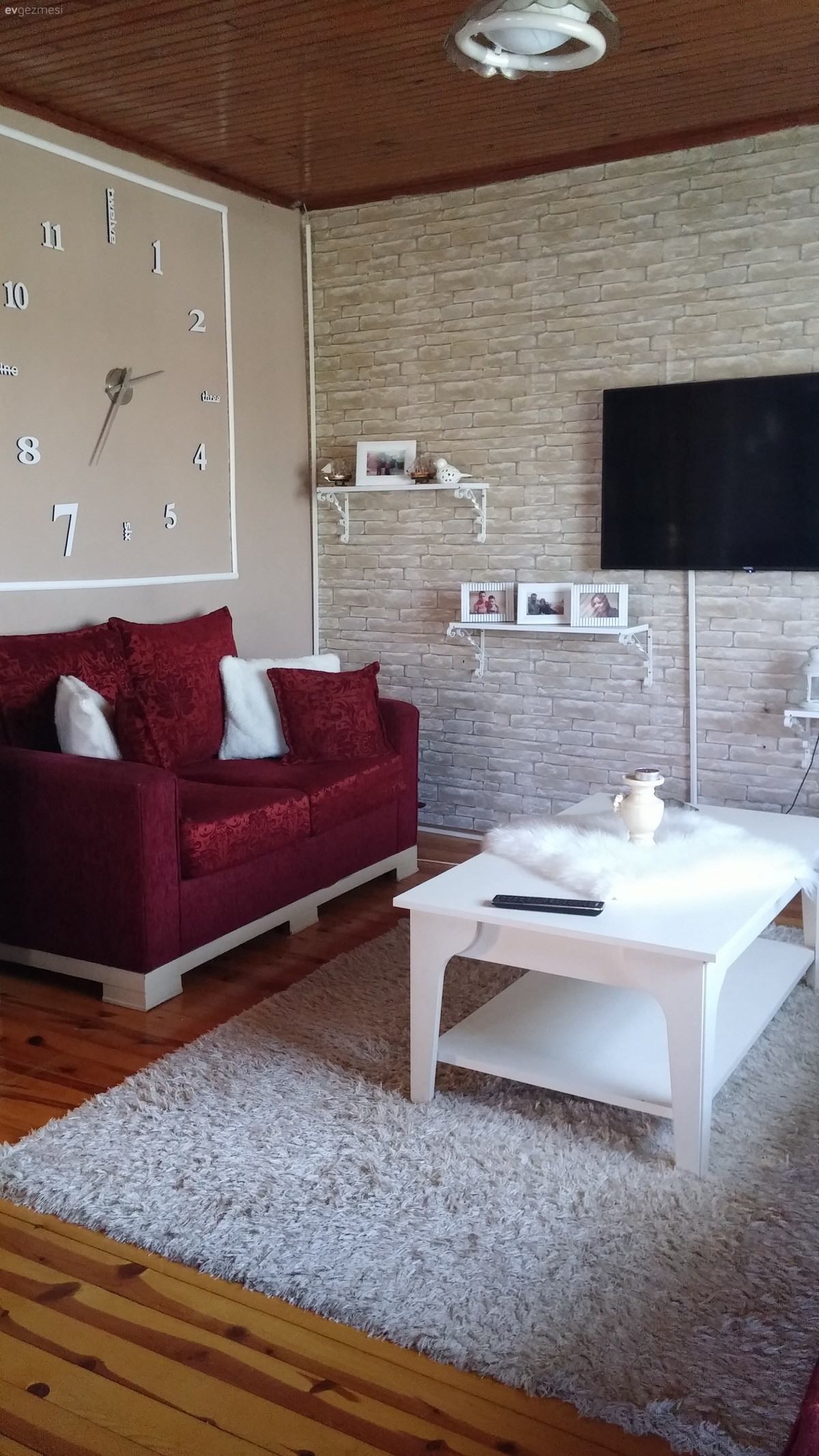 Pelüşleri kaldırın bence eşyalar güzel parke kapı renkleriniz tavanlarınız mutfağınız bence çok güzel dağ evi gibi duruyor ahşap renklerini çok sevdiğim için belki de. taş duvar da güzel biraz raflar dağinik duruyor ahşap raflarla değistirip aynı tarafta toplayıp bir de parkelerinizin renginden dolap gibi bir şey eklerseniz daha iyi olur bence. imkanınız varsa şömine ve bir iki tane ahşap obje eklerseniz değişik bir ev olacak