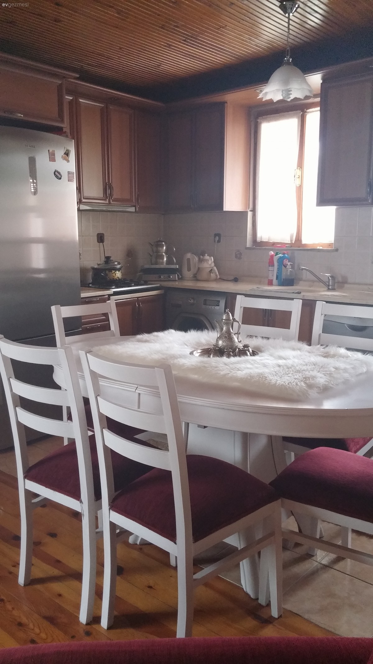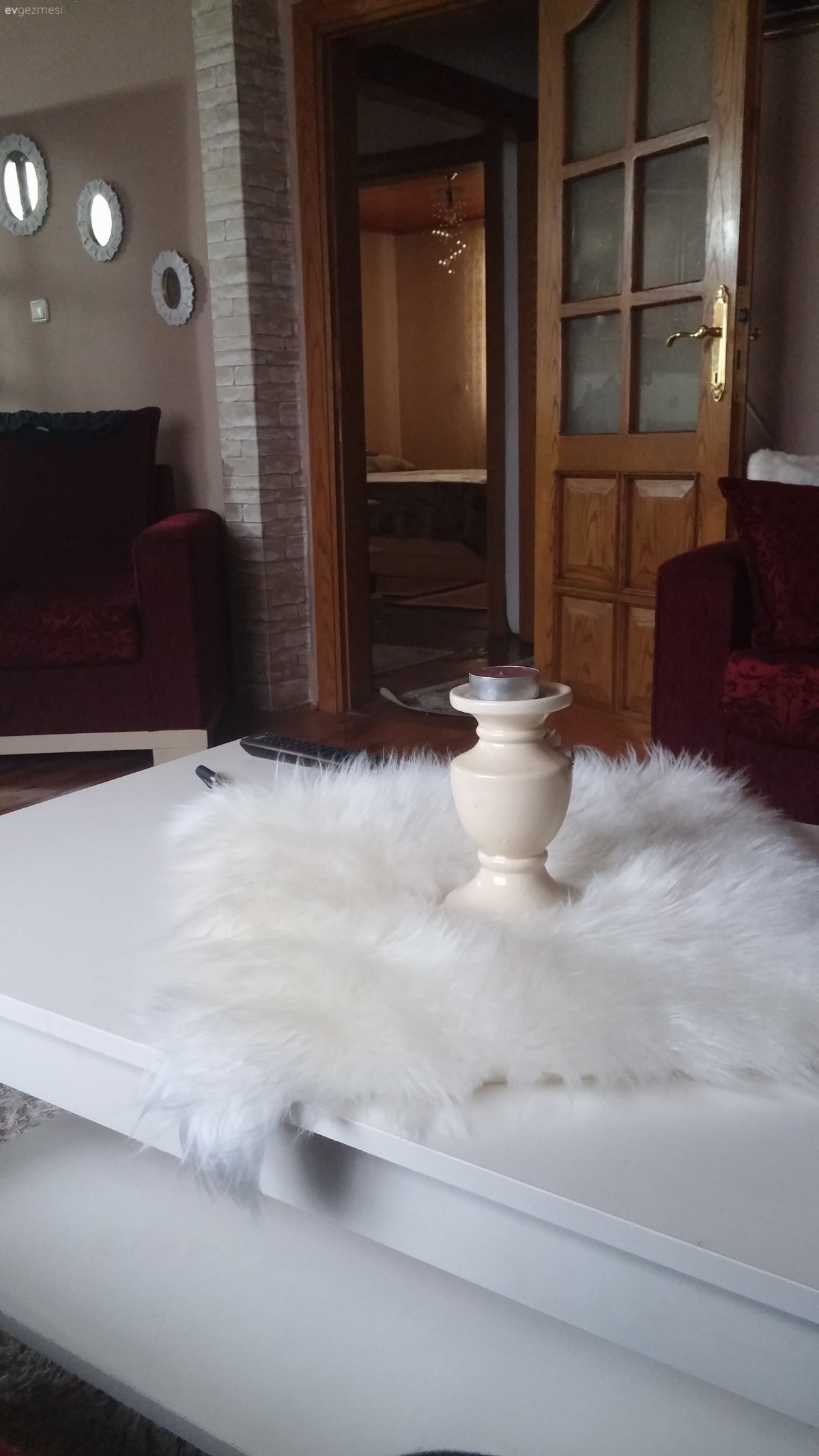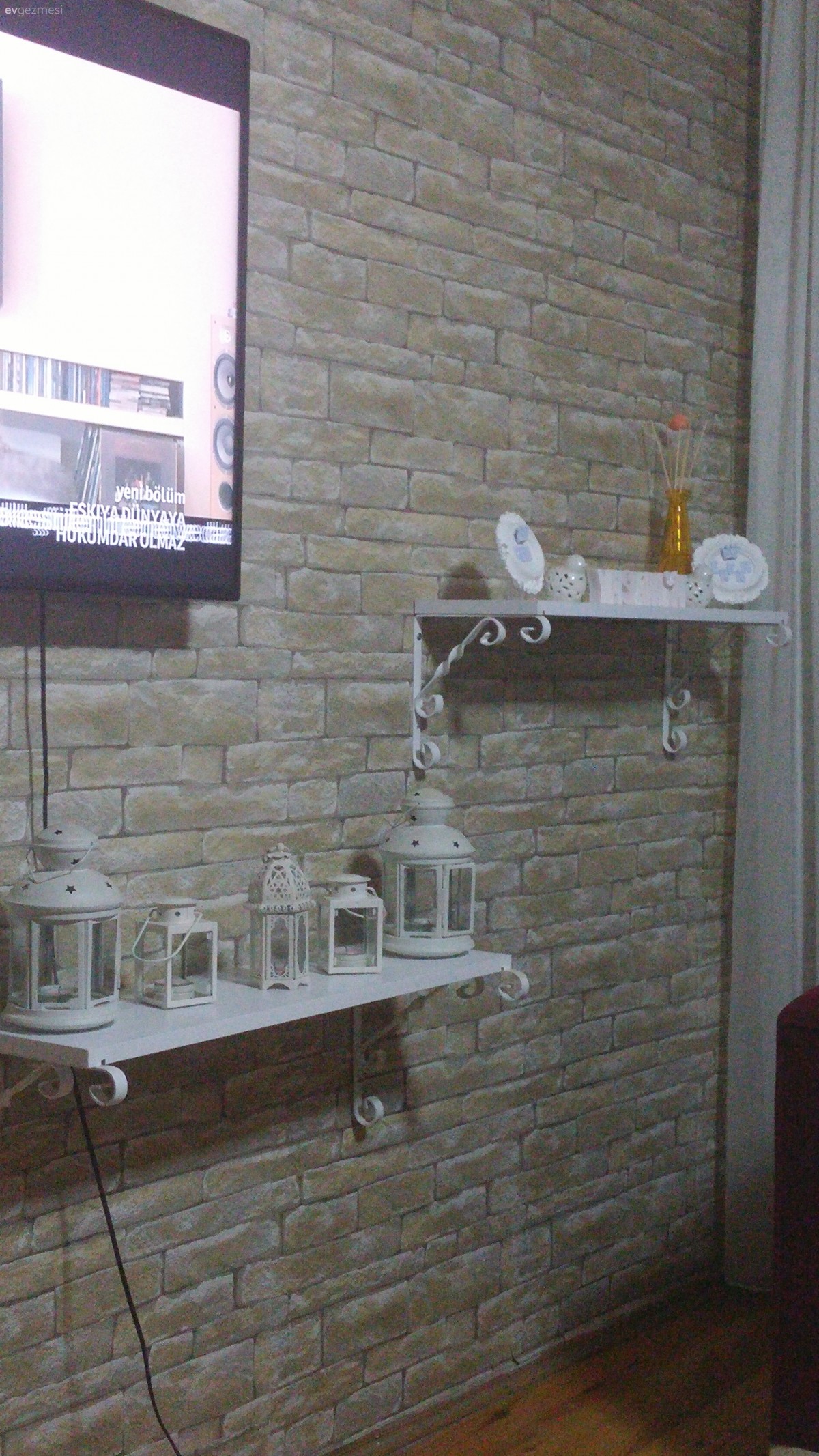 Pelüşleri kaldırın bence eşyalar güzel parke kapı renkleriniz tavanlarınız mutfağınız bence çok güzel dağ evi gibi duruyor ahşap renklerini çok sevdiğim için belki de. taş duvar da güzel biraz raflar dağinik duruyor ahşap raflarla değistirip aynı tarafta toplayıp bir de parkelerinizin renginden dolap gibi bir şey eklerseniz daha iyi olur bence. imkanınız varsa şömine ve bir iki tane ahşap obje eklerseniz değişik bir ev olacak