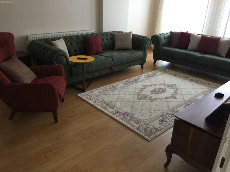 Daha çok salon mobilyası gibi ama halıyla uyumlu bence ama biraz büyük geldi bana halı, koltuk hoş, tülünüz de güzel duruyor, minderler dağınık göstermiş biraz, sanırım olduğu gibi çekmişsiniz. ?