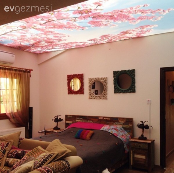 Dekoru tamamlayan aksesuarların rengi duvarda da kullanımda. Özellikle duvar kağıtlı alan odaya hareket getirmiş..