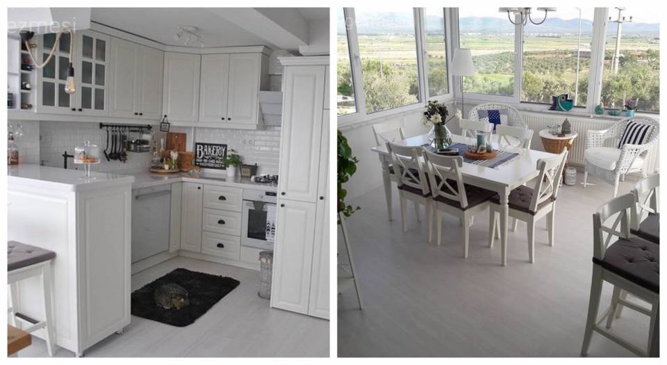 Oldukça geniş bu mutfak, içinde şık bir yemek masası da barındırıyor. Beyazların hakimiyeti, yumuşak tonlar ve cıvıl cıvıl desenlerle tamamlanıyor. Melike hanımın dekoru konusunda daha da yapmak istedikleri var. Keyifle eksiklerini tamamlıyor. Buyrun konuk olalım..