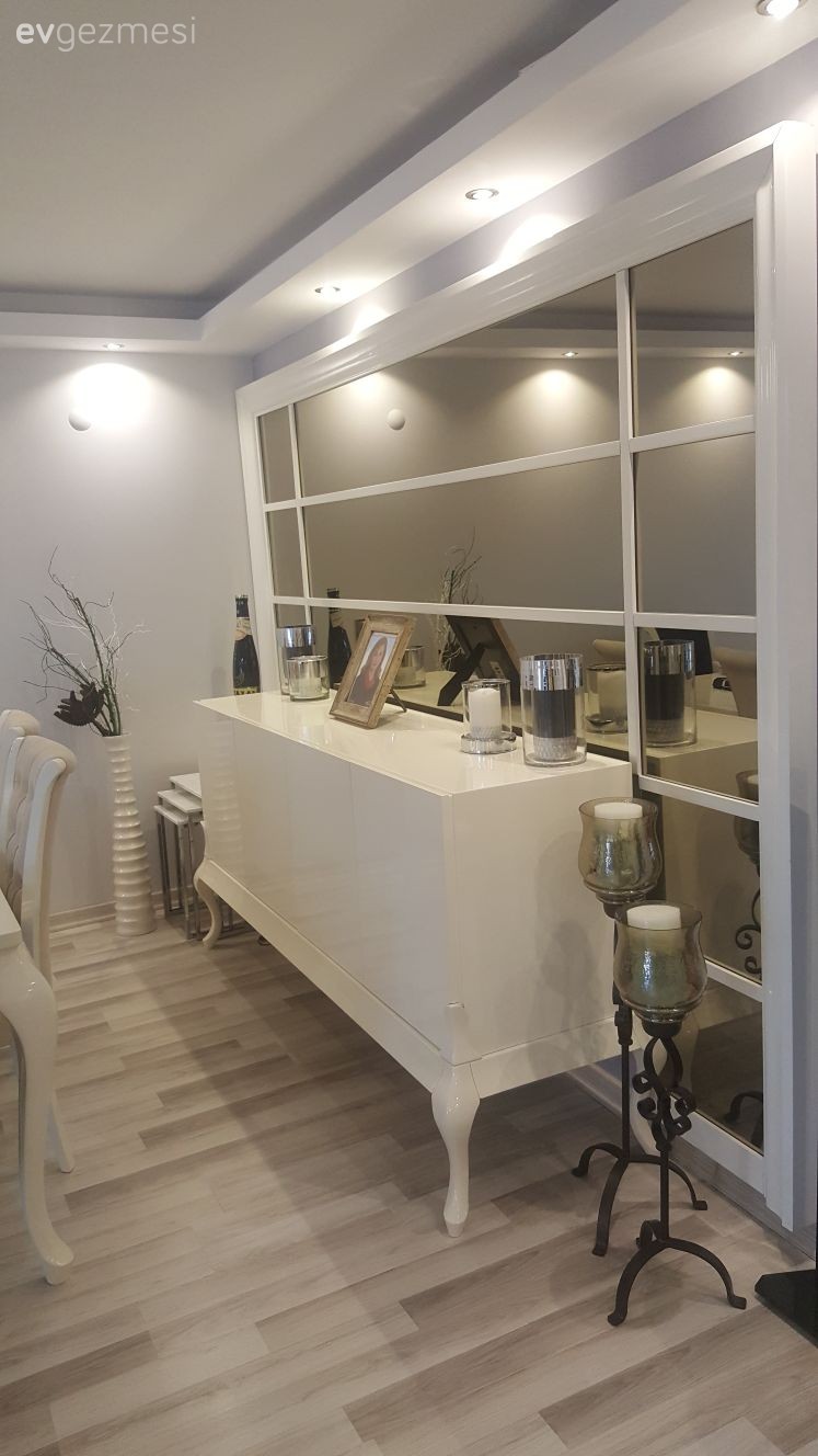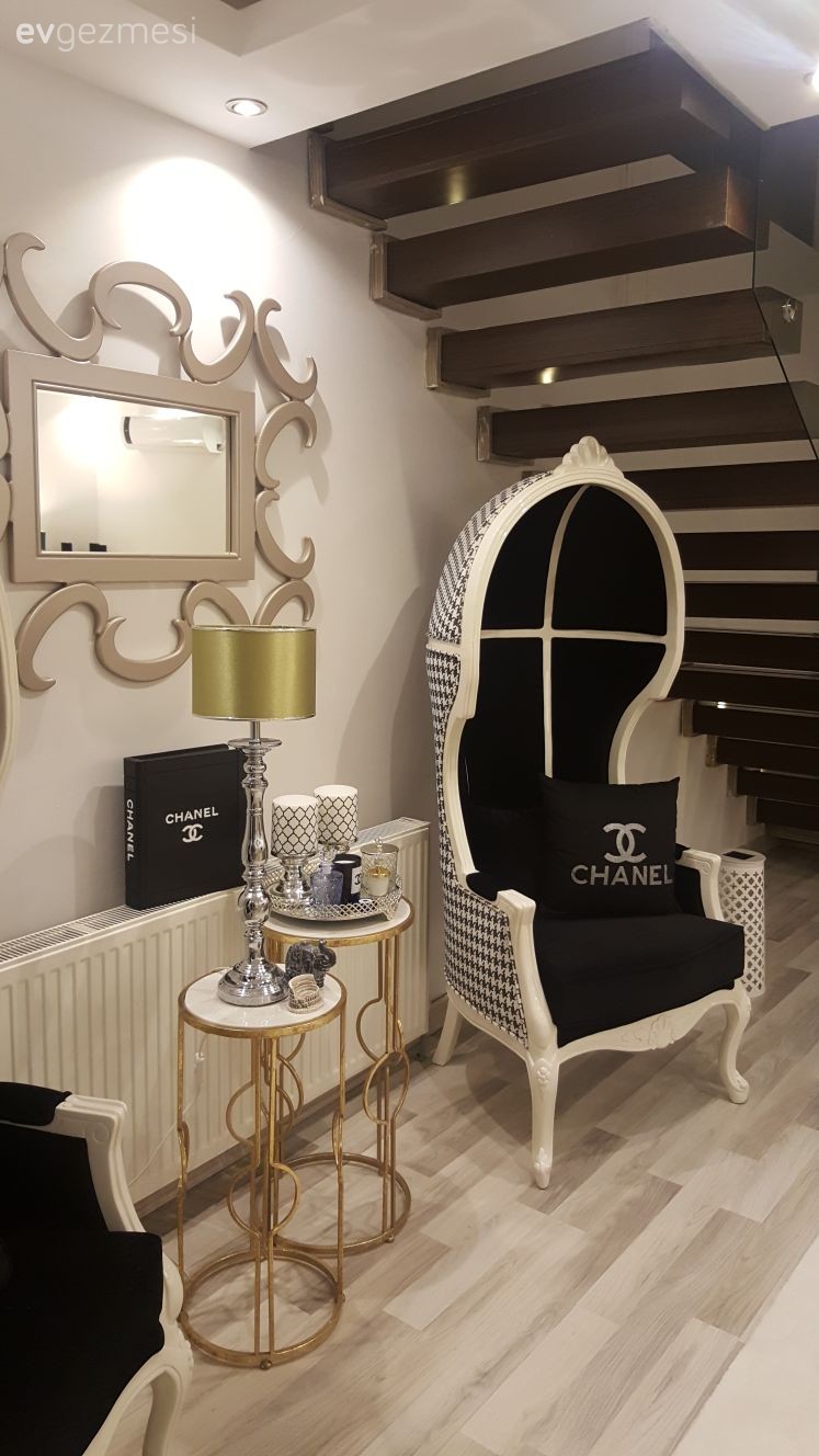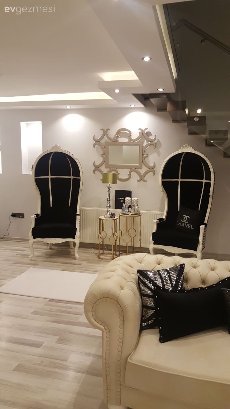 Lüks detayların göze çarptığı salonunda, bu hissi tamamlamada en başarılı renkler olan siyah ve altın ön planda. Tavanda spot aydınlatmalar, duvarda büyük boyutlu ayna, aydınlatılmış nişler ve metal ayakları, zarif sehpalar evin şıklığını tamamlayan birkaç parça. Devamından fotoğraflar da çok yakında burada. Buyrun konuk olalım..