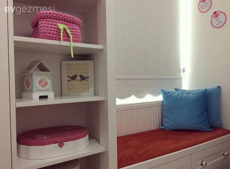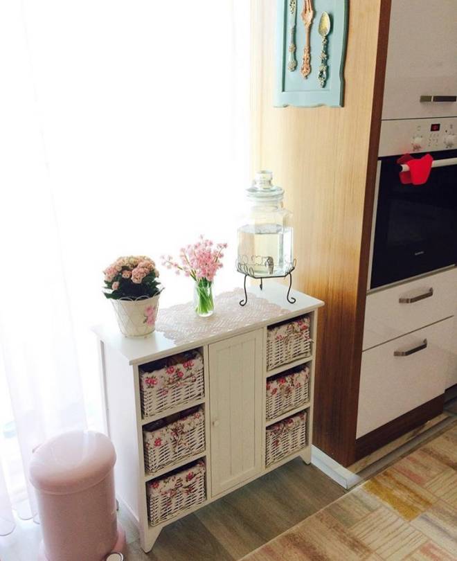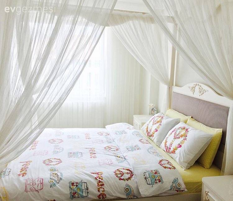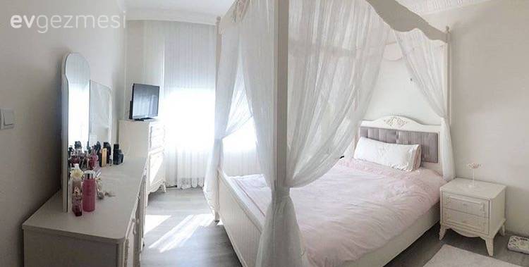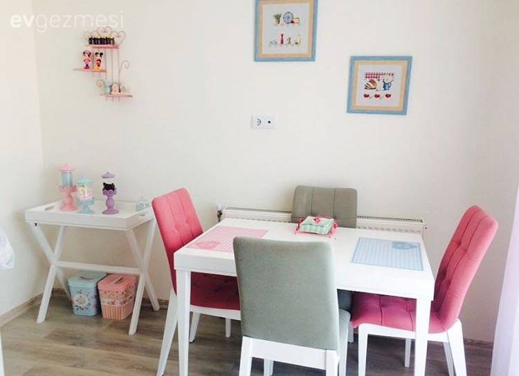 Cibinlikli yatak odası, cam önü sedirli giyinme odası, renkli mutfak sepeti ve renkli sandalyeler bu zevkli dekordan alınabilecek birkaç güzel fikir. Salonda mordan, pembeye açık tonlardan, koyuya bu yumuşak geçiş, göz yormayan bir his oluştururken; oturma odası gri ve mavi, serin renkleri ile sakin ve huzurlu. Buyrun konuk olalım..