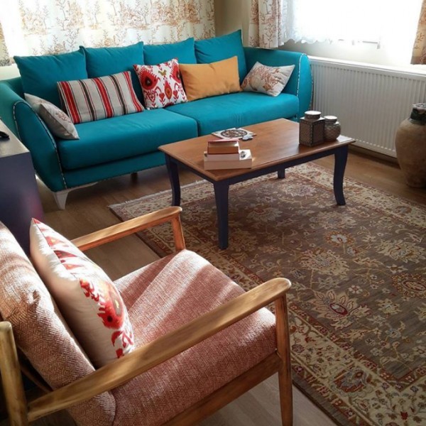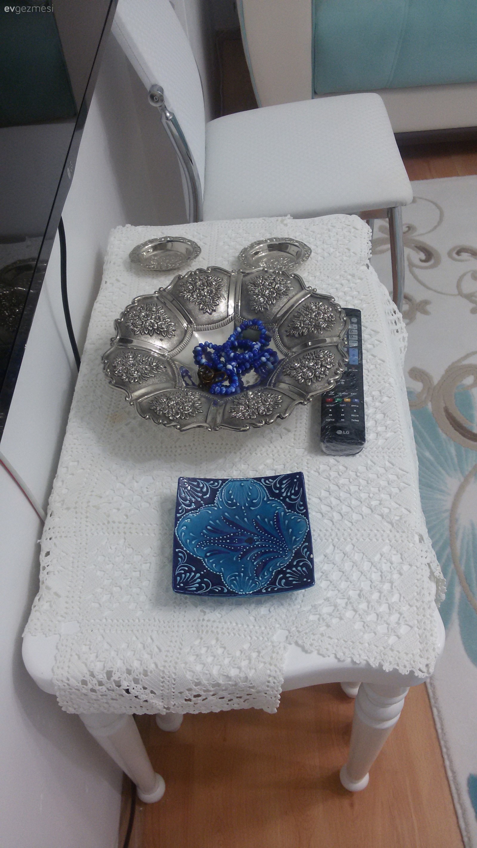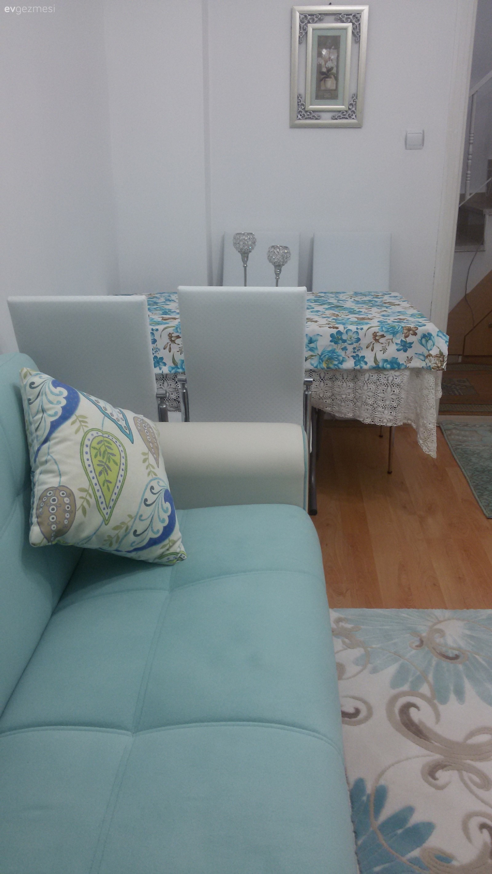 Masa ve uzerineki ortu mutfak masası havası vermiş.Hali desenli perdeler ve masa örtusu desenli. Cokfazla olmuş. Köşe takımımız ve hali çok şik. Perdeler ve ortu uymamış. Perde sade olmalı. Masayı TV yanındaki sandalyeleri kaldırın. Masanın yerine güzelbir berjer küçükbir kkitaplık olabilir. Dantelleride kaldirsaniz daha hoş olur.üç katlı koseyede küçük biblolar koyabilirsiniz. Bende mavi ve tonlarını cok seviyorum. Güle güle oturun.