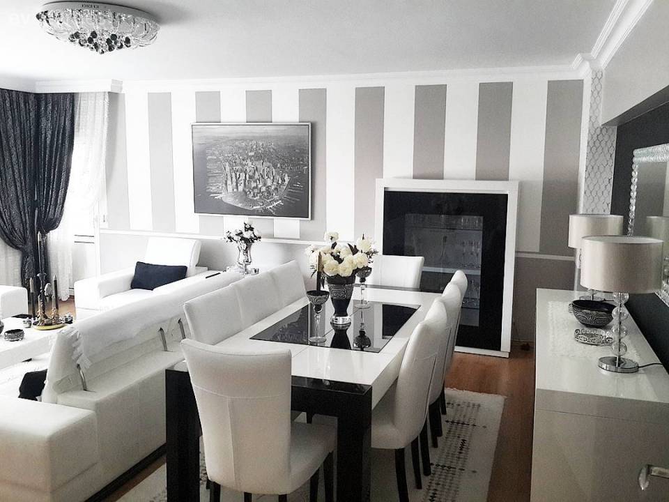 Grinin en yakın arkadaşlarından altın, kırlentler, orta sehpa üzeri dekoratif objelerde tercih edilirken, siyah, modern yemek masası üzerinde kullanılan büyük boyutlu bakır sarkıtlar, bu bölüme dikkat çekiyor. Genç bir çift olan ev sahiplerimizin, siyah, beyaz fotolarından oluşturdukları galeri duvarı ise yine dekora hoş bir dokunuş. Buyrun konuk olalım.