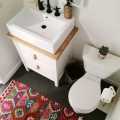 Merhaba, öncelikle kolaylıklar dilerim. Gördüğüm kadarıyla biraz karanlık ve küçük bir banyo. Aydınlık göstermek için beyaz fayans ve dolaplar kullanmanızı tavsiye ederim. İkea'da da olan dolap üstü küçük lavabolar çok kullanışlı seçenekler olabilir. Fayansları kırdıramıyorsanız delik olan yerleri dolgu malzemesiyle doldurup, fayans boyasıyla boyayabilirsiniz.
