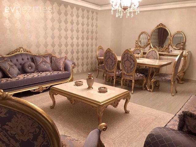 Salonda klasik stilde koltuklarda göz alıcı bir yeşil ile grinin uyumu tercih edilmiş. Takıma uyum sağlamayan orta sehpa yine yeşilin hoş bir tonuna boyanmış. Salonun şıklığından sonra balkon, çocuk odası ve mutfak desen ve renklerin enerjisine sahip. Buyrun konuk olalım..
