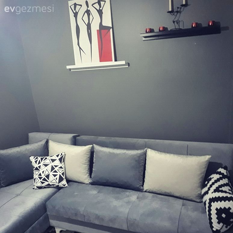 Yeni evli Gamze hanım, sade bir renk paleti tercih ettiğinde evinde modern stilde konforlu mobilyaları hem aksesuarları, hem duvar dekorlarında geometrik çizgiler ile tamamlamış. Gri rengi hem salon, hem oturma odasında kullanan ev sahibimiz, açık renkli mobilyalarını, duvar rengini koyu seçerek ön plana çıkarmış. Gamze hanım sizlerin de yorumlarınızı bekliyor, buyrun konuk olalım.