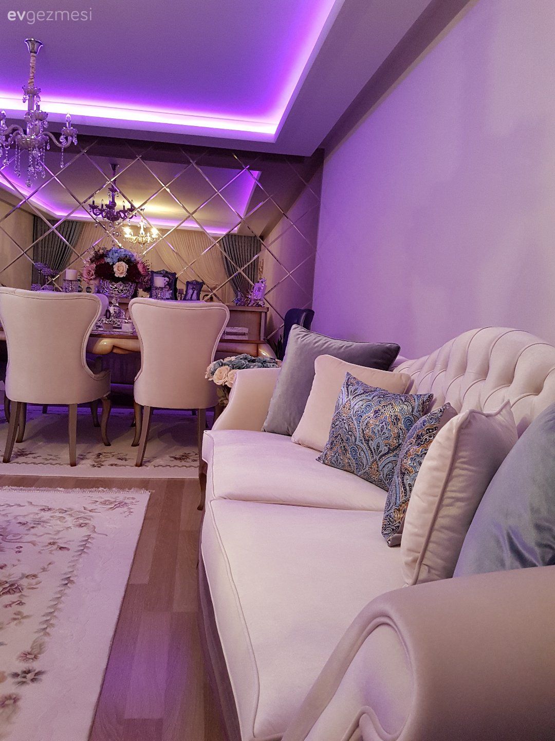 Asma tavan, Ayna, Beyaz, Led aydınlatma, Mavi, Mor, Salon, Yemek Odası