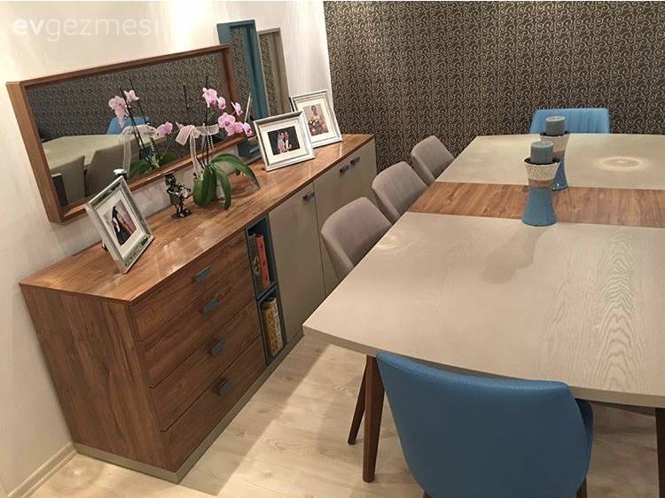 Salonda çıtalar duvarları zenginleştirip, göz yormayan, estetik bir duvar dekoru oluşturuyor. Gri ve mor ikilisi ana renklerde; bu asil renk paleti dekora sofistike bir görünüm kazandırıyor. Çıtadan çerçeveler arasında saat ise harika bir fikir.
