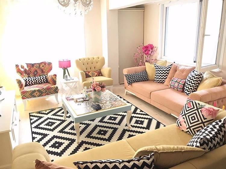 Bordo ve gri koltuklar eskitme bir patchwork halı ile kullanılmış. Bu renk paletini tamamlayan üçüncü ton ise siyah. Mobilyalarda parlak siyah, alanın göz alıcı hissini tamamlıyor. Asma tavan ve duvardaki büyük boyutlu metal saat, modern stili tamamlayan dokunuşlar.