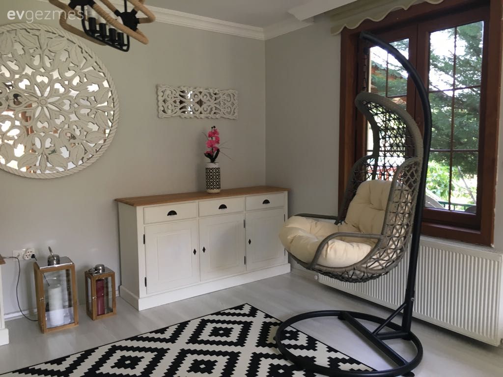 Rustik tarz severler için özellikle de aksesuar seçimlerinde bu güzel evden alınabilecek pek çok fikir var. Büyük pencere ayna, halat ve metal avizeler, ahşap büyük kahve masası, birbirinden zevkli ahşap pano duvar dekorları, fenerler ve bunlarla beraber alanın stilini de tamamlayan ahşap çıtalı pencereler.. Uyumlu ve göze hitap eden bir dekor önemli ama Esracan hanım için öncelik içine girer girmez huzur buldukları, konforlu ve rahat bir salon sahibi olmak olmuş. Çok da güzel olmuş. Buyrun konuk olalım..