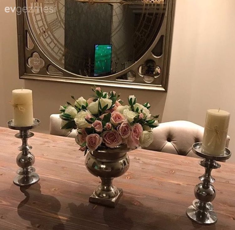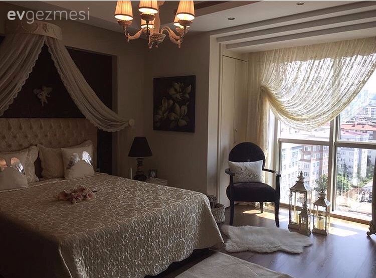 Salonda zemin alanın klasik esintilerine uygun olarak koyu tonda bir parkeden seçilmiş. Aksesuarlarda gümüş şamdanlar, gümüş vazolar içinde çiçekler, büyük boyutlu zemin vazoları tercih ediliyor. Sıcak tonların ve ahşap mobilyaların tercih edildiği salon, hem dokusu, hem renkleri ile şık ama bir o kadar da davetkar, sıcacık bir atmosfere sahip. Yatak odası dekorunda ise yine aynı çizgide tercihler ön planda. Yatak başı duvarında koyu renkli duvar kağıdı yatak tacını öne çıkarırken, yine bu odada post halı, şamdanlar gibi alana sıcaklık katan detaylar kullanılmış. Buyrun konuk olalım..