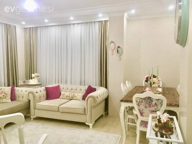 Salonda klasik stil tercih eden ev sahibimiz, krem renkli şık mobilyalarını altın detaylarla tamamlamak istemiş. Fransız paneller altın renkte; hem tavan, hem duvarlarda kullanılmış. Duvarlarda dikkat çeken bu alanların içlerine ise klasik tablolar yerleştirilmiş.