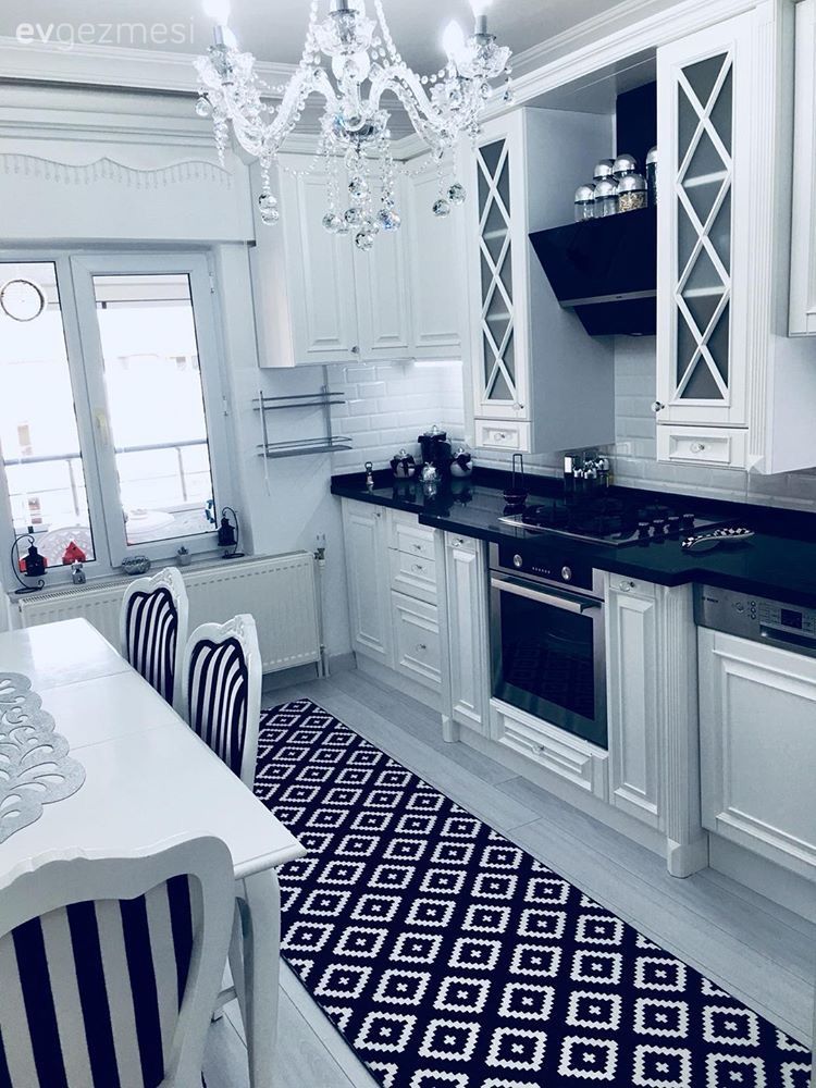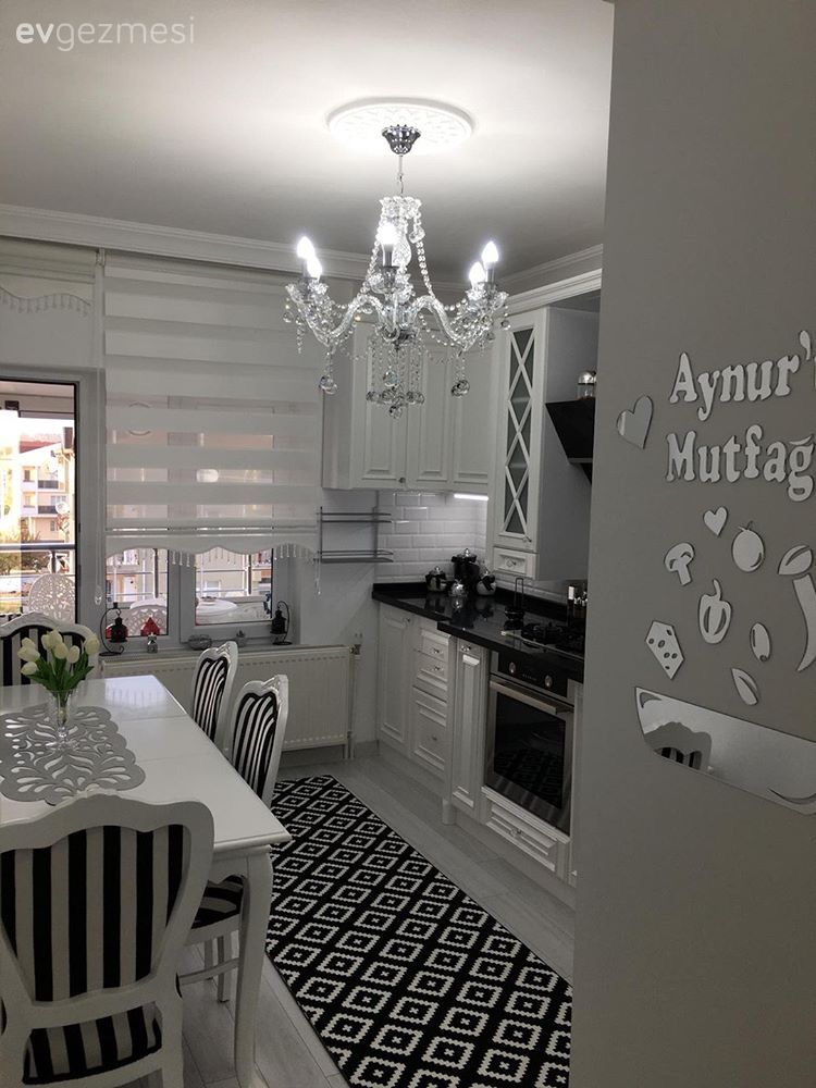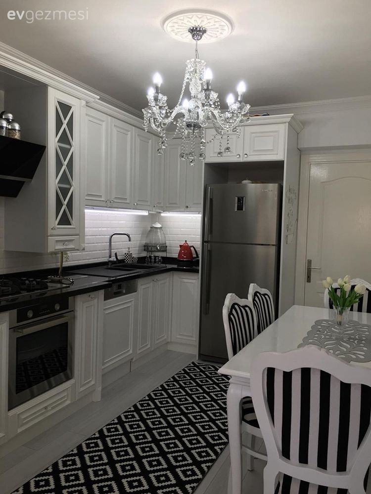 Aynur hanımın her detayında uyum yakaladığı evinde klasik ve modern stil harmanlanıyor. Ortaya özgün ve şık bir dekor çıkıyor. Mutfak dekorunda dolaplar, avize seçimi, aynalı aksesuarlar ile yakalanan klasik görünüm, siyah, beyaz geometrik çizgide halı ve sandalyeler ile modern bir dokunuş kazanıyor. Ev sahibimiz farklı stilleri bir arada kullanmayı sevse de, ana renkler konusunda seçimleri kontrastı yüksek renklerden yana.