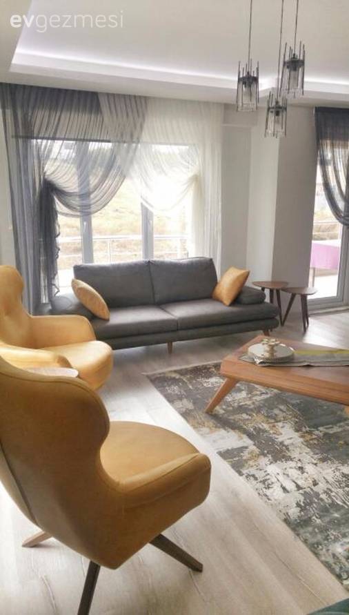 Koltuk takımı aynı koltuklardan seçilmemiş. 2 farklı koltuğun, farklı renklerde kullanılarak oluşturulduğu takım aynı stilde, renkleri ise salonun renk paletini belirliyor. Farklılıklar arasındaki bu harmoni alana, uyumsuzluk yerine sıradışı görünüm kazandırıyor. Hem mobilyalar, hem aksesuarlar oldukça klasik. Ama kullanılan gri, beyaz renk paleti alana modern bir çizgi de katmış.