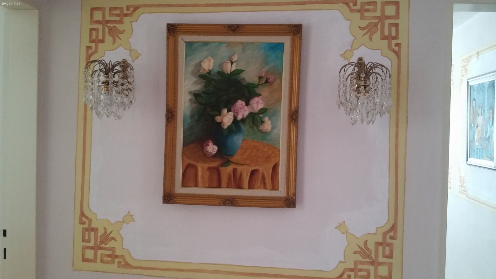 Duvarlar çok kalabalık altın renkle geçilen şeriler çok abartılı olmuş duvarlar sadeleşirse evinizin güzelliği belli olur benim fikrim tabii ev sizin mıutlulukla oturun