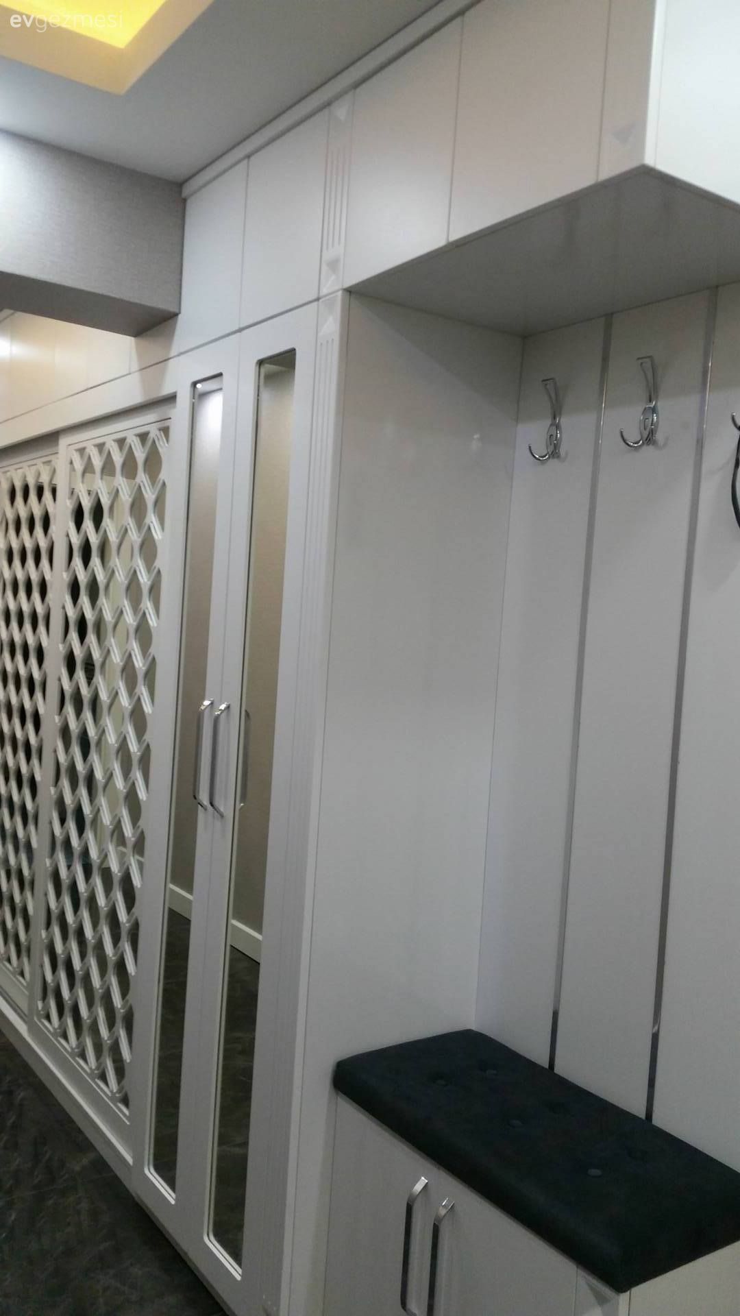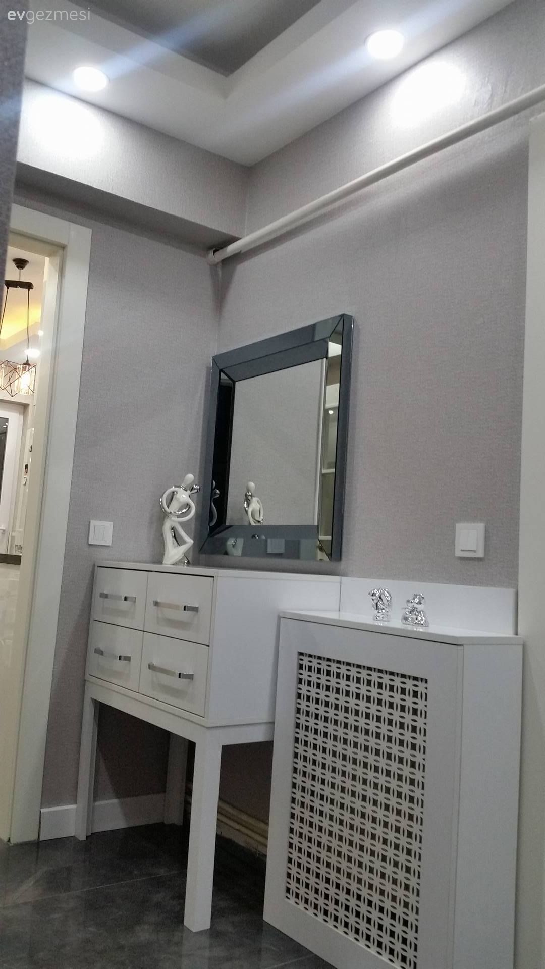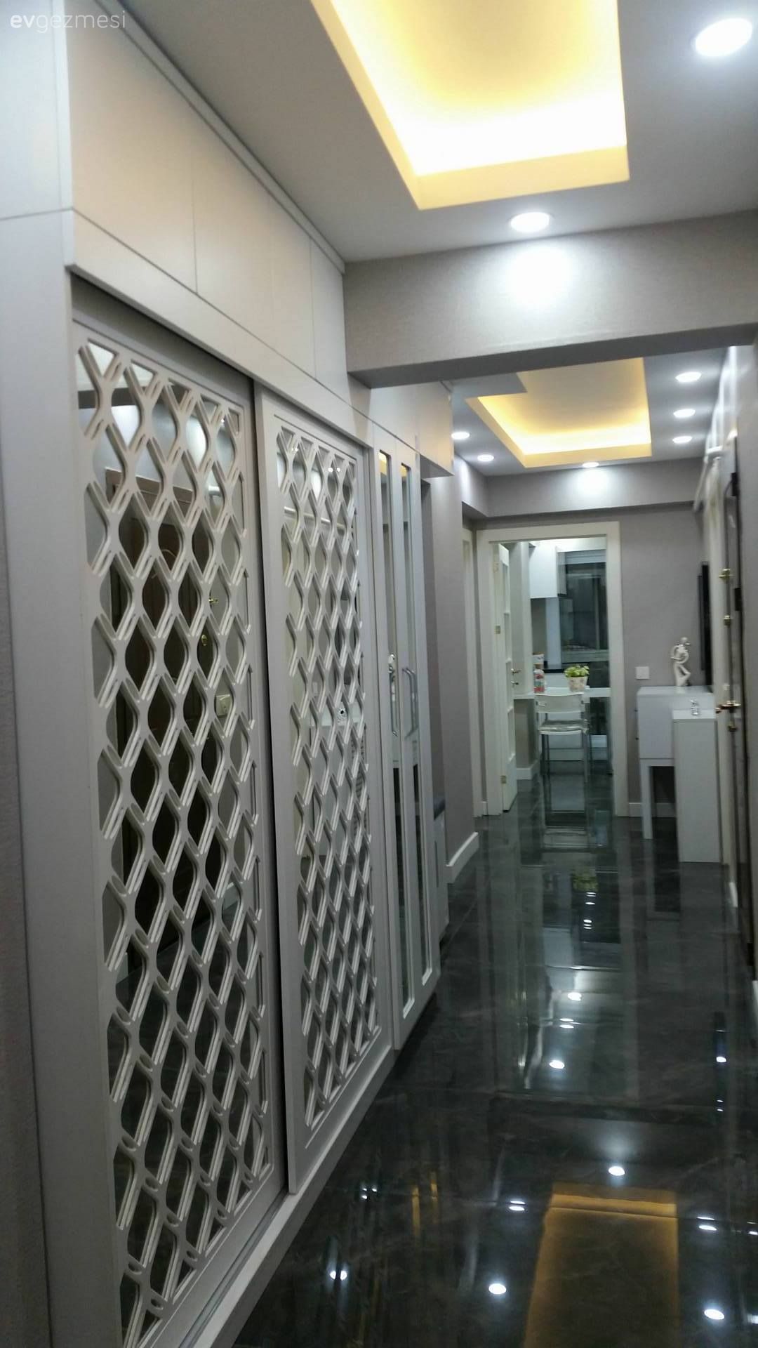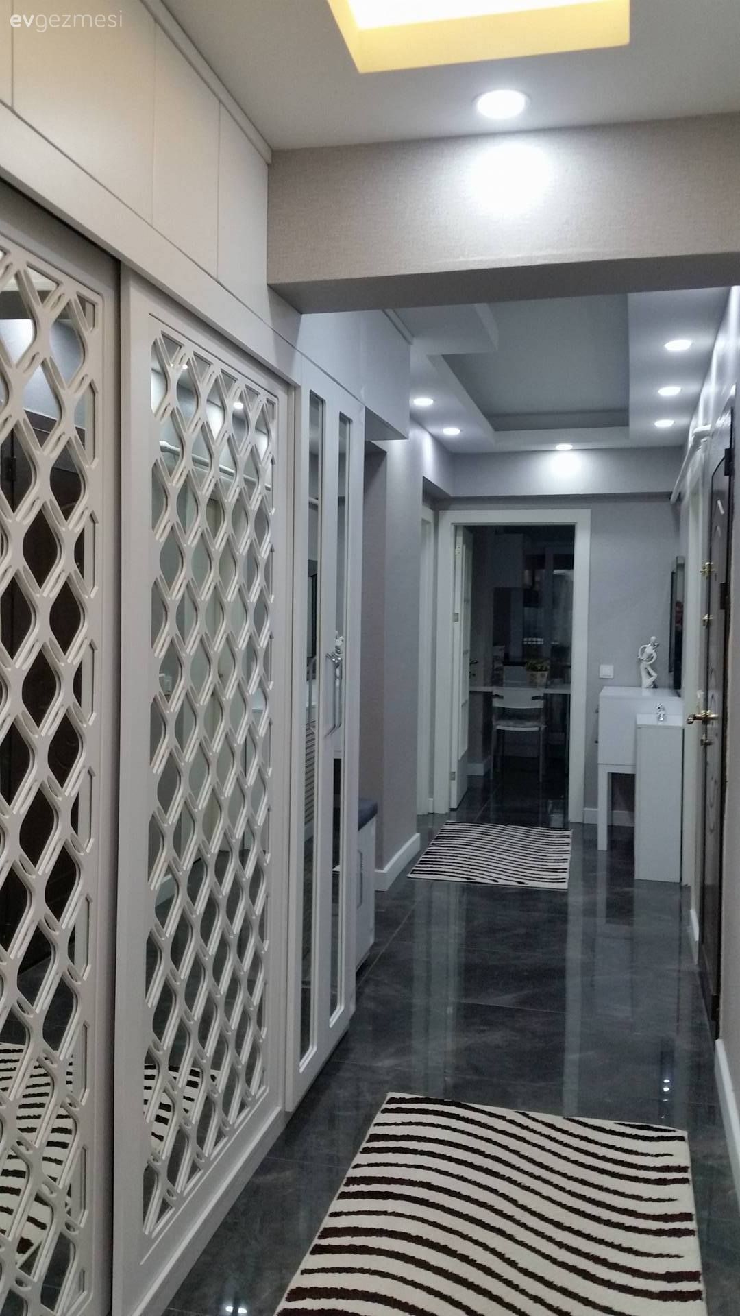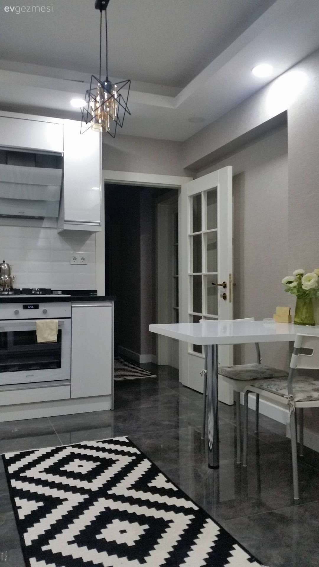 Tekrarlayan geometrik çizgiler modern stili tamamlıyor. Antrede vestiyer kapaklarında ayna üzeri lazer kesim detaylar, mutfakta siyah, beyaz geometrik desenli halı bunlara örnek. Ev sahibimiz yeni dekoru tasarlarken estetik kadar kullanışlılığı da esas almış. Bolca depolama alanı elde etmek önceliklerden olmuş.