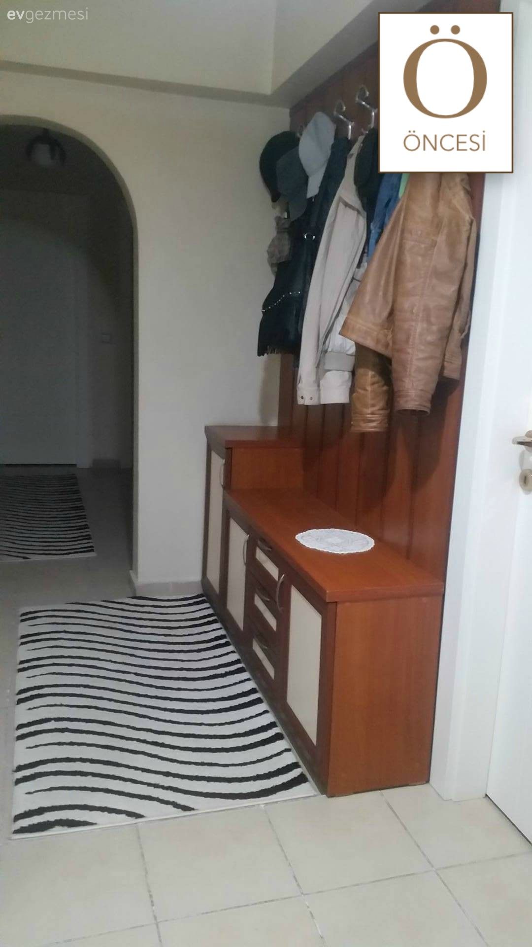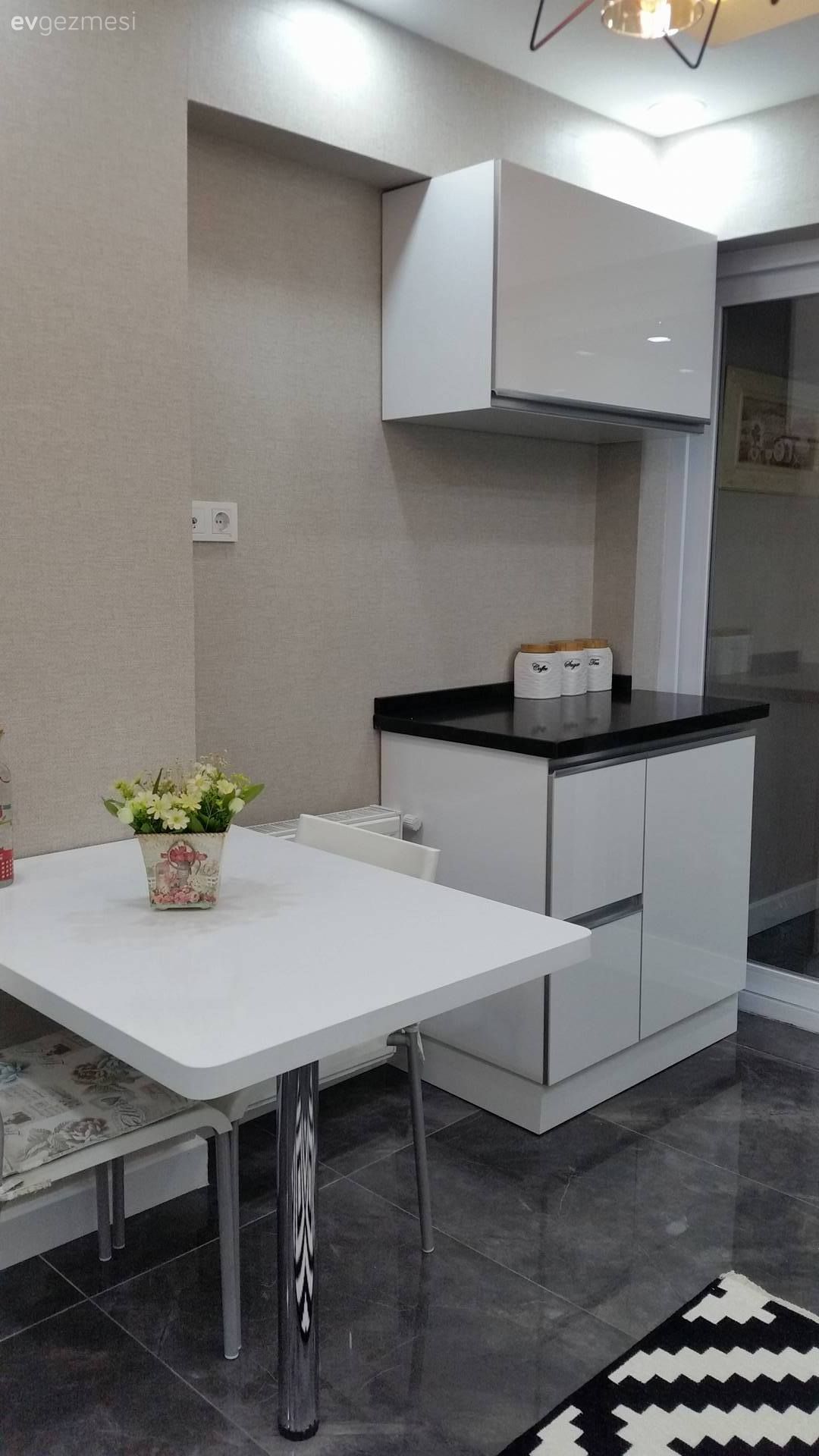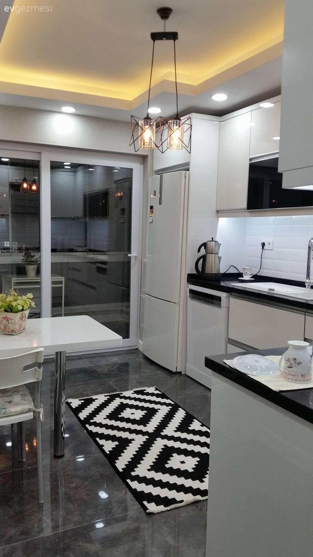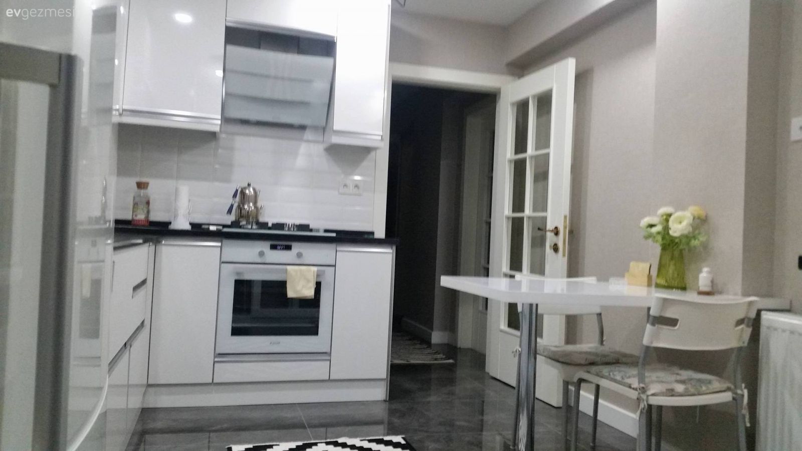 Antresi ve mutfağında kapsamlı bir tadilat ile yenileme yapan ev sahibimiz Nuray hanım, eski halini bilenlerin tanımakta zorlanacağı, adeta başka bir ev sahibi olmuş. Siyah ve beyaz kontrastına hem antre ve holde, hem de mutfakta yer verilmiş. Dolap ve duvarlarda kullanılan beyazı, koyu renkli zemin seçimi ön plana çıkarıyor.