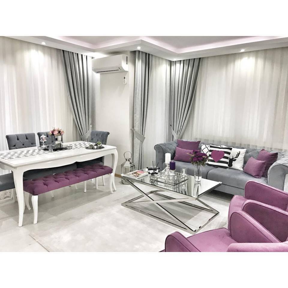 Salon dekorunda ise ana renklerde tercih edilen sadelik, mor kırlent ve fon perde, boydan boya ayna gibi dokuşlar, alana asil ve şık bir hava katmış. Buyrun konuk olalım..