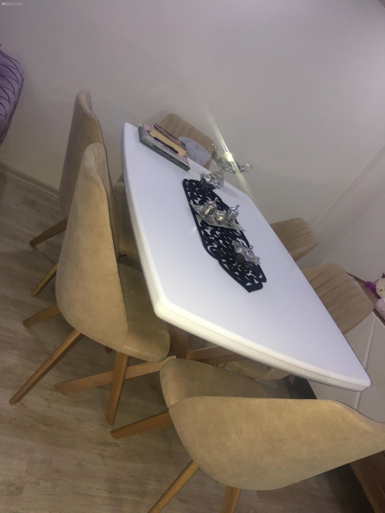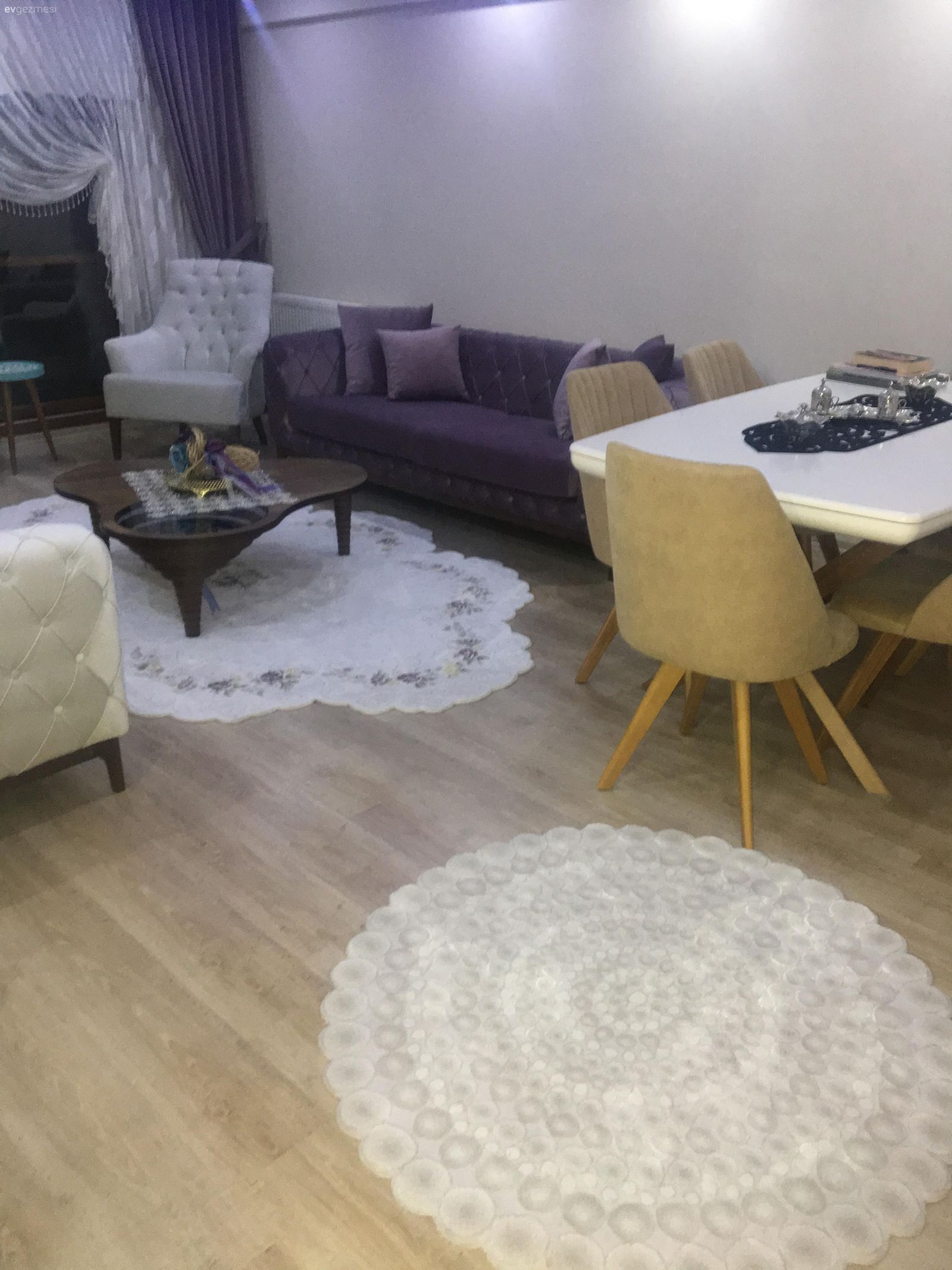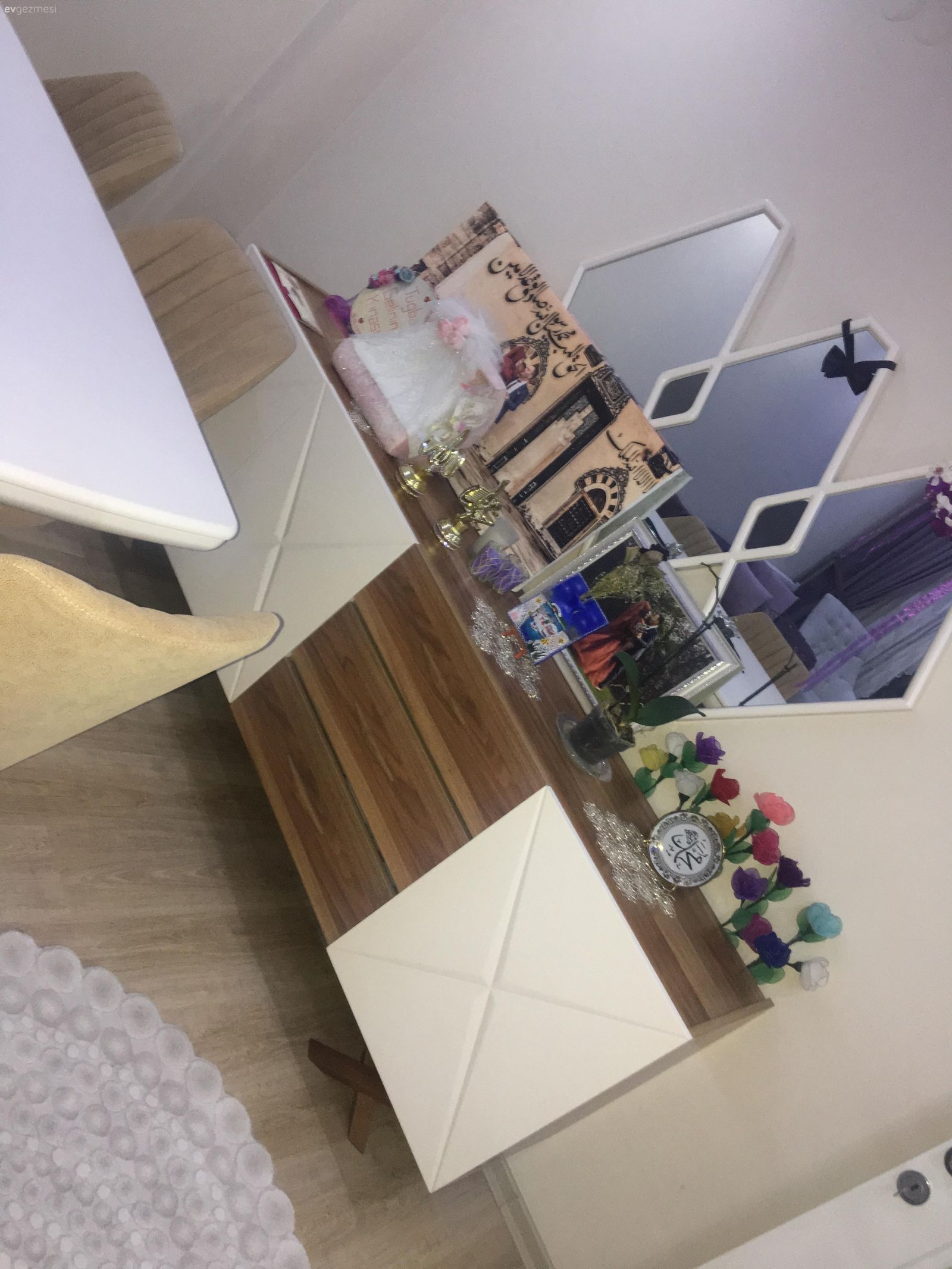 Sanırım yeni evlisiniz duvaginizi asmissiniz ? hayırlı olsun. Bence eşyalarınız salondaki haliniz çok guzel sadece konsolun üstü biraz fazla dolu orayı sadelestirin uyumlu aksesuarlar koyabilirseniz daha güzel görünür. Birde masanın üstünde ki siyah runner rengi uymamis. Onun dışında herşey güzel. Güle güle oturun.