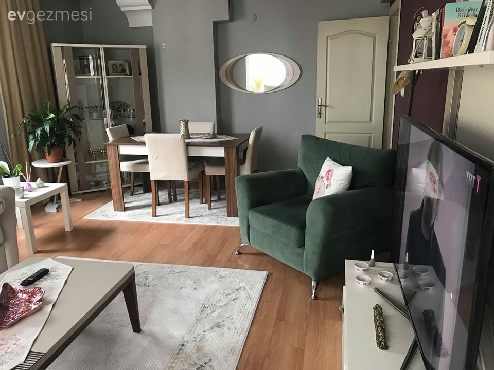 Berjerler pencere önünde daha derli toplu durur bence. Ayaklı aydınlatmayı köşedeki saksının yerine koyup, saksıyıda tv ünitesinin sol yanına koyarsanız daha hoş olabilir. Pencerenin önündeki ikili koltuğuda yemek masasının önüne yani berjerlerin yerine koyulabilir. Aynayı da sol tarafındaki kirişe yan cevirerek uzunlamasına asabilirsiniz. Vitrinide duvara çapraz degilde düz şekilde koyarsanız tamamlanır. :) Güle güle oturun. :)