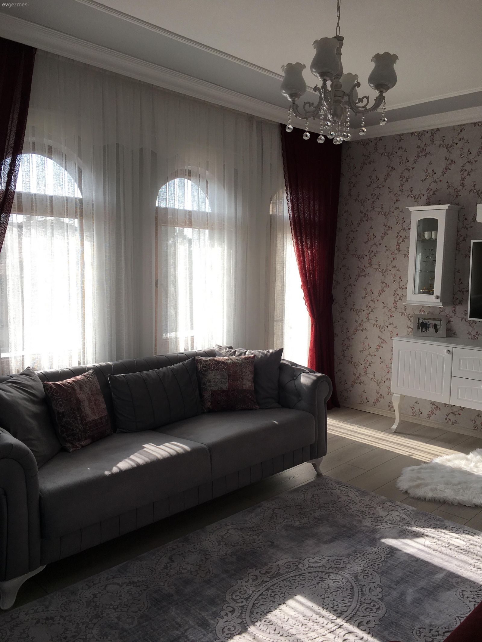 Oturma odasında konforlu mobilyalar seçilse de, şıklık yine ön planda. Gri ve bordo renk paleti tv ünitesi arkası duvarında kullanılan duvar kağıdı ile hareketlenmiş. Buyrun konuk olalım..