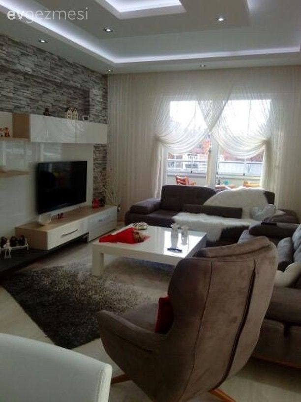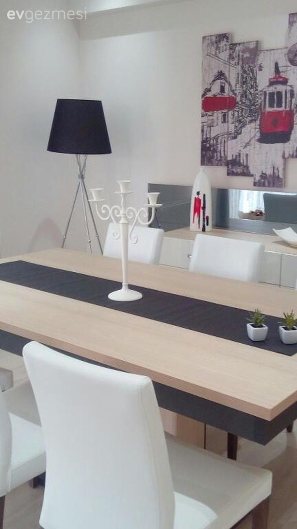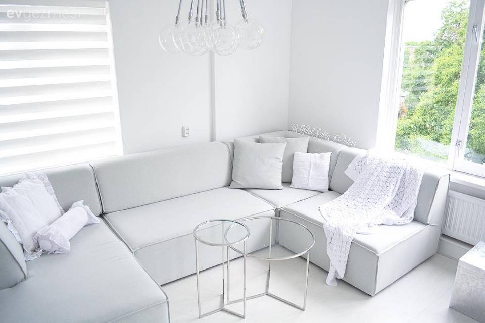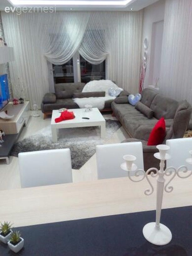 Saime hanımın düz hatlar ve nötr renklerle sade mobilyalarına aksesuarlarla kimlik kattığı evinde, mobilyaların konforu rahat ve keyifli bir alan oluştururken, koltuk şalları, tavan aydınlatmaları ve duvar kağıtları, dekoratif objelerle beraber alana kimlik katıyor. Şık ve keyifli evine buyrun konuk olalım..