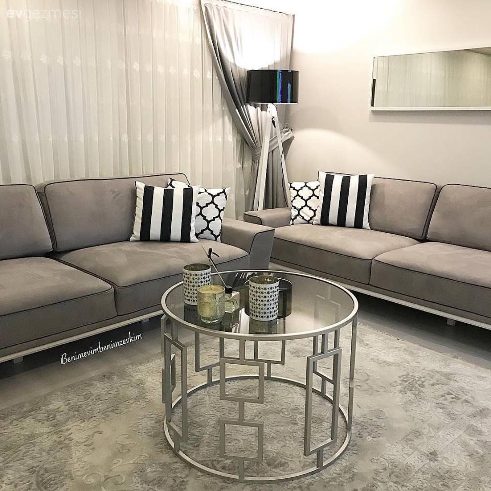 Krem kahve tonlarındaki eve bence açık mavi tonlar yakışır. Sakin huzurlu bir görüntü veriyor. Fazla sayıda ve ufak ufak aksesuarlar da olmazsa salonunun çok güzel olacağa benziyor.