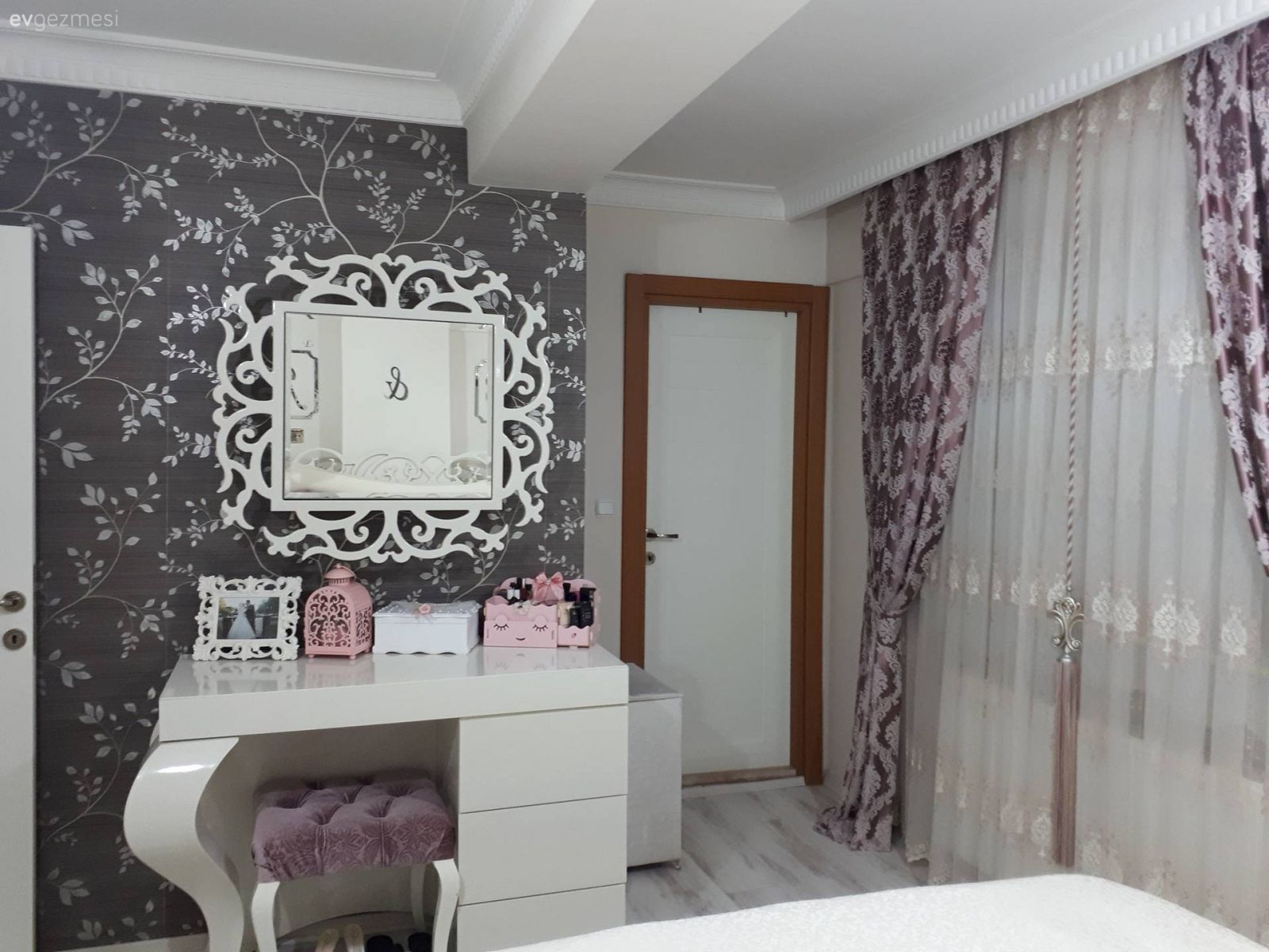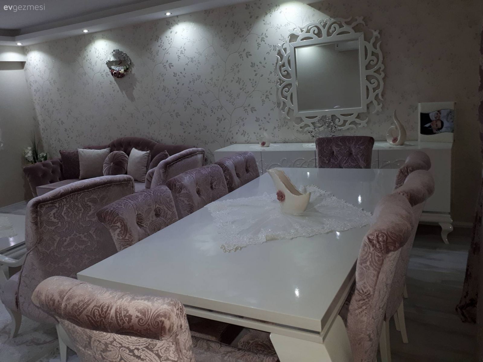 Klasik mobilyalarını pastel sıcaklarla tamamlayan Burcu hanım, tekstik ürünlerinde desenler ile dekora hareket katmış. Her odada uyumlu renk ve desenlerde duvar kağıtları ile dekoru tamamlamış.