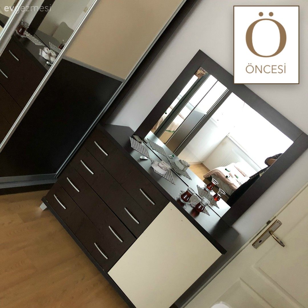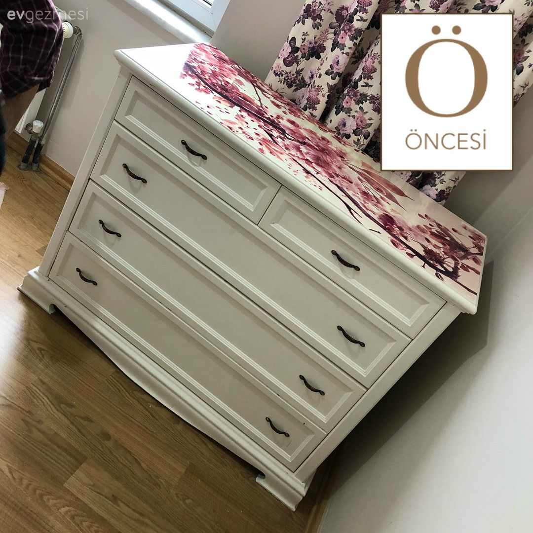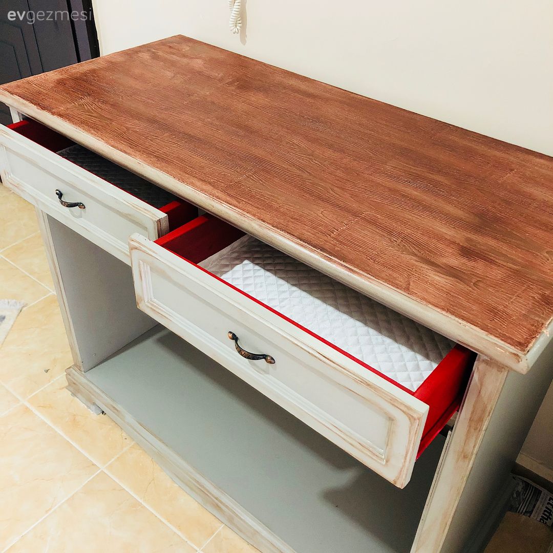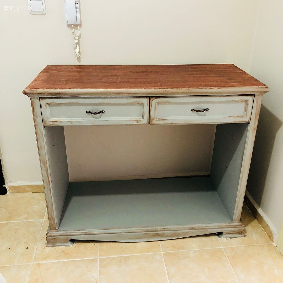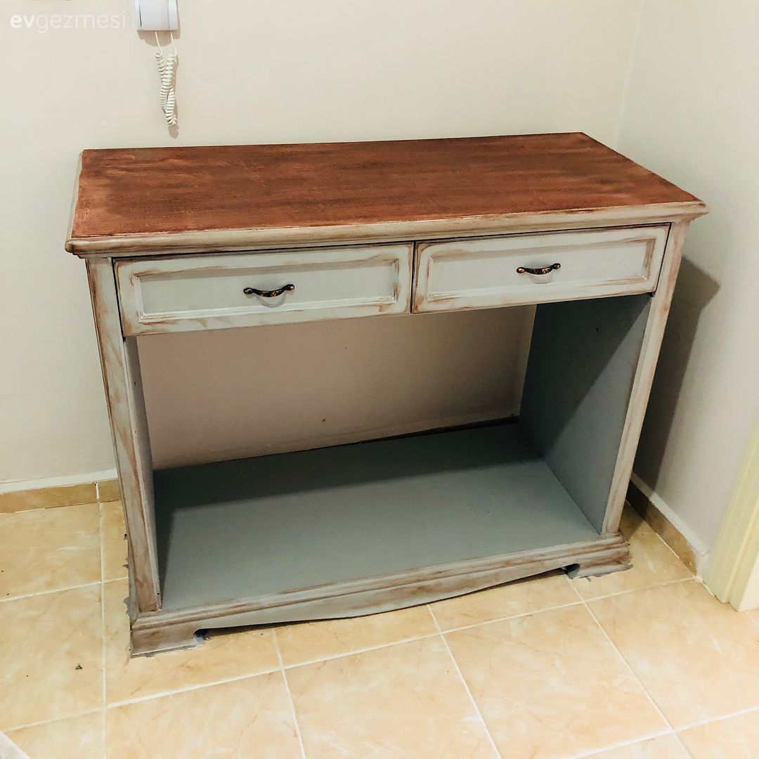 Çekmecelerinin çoğu zor açılıp, kapanan, boyanmaya çalışılmış ama pek de başarılı olunmamış şifonyer ikinci el olarak alınmış; eskitme gövdeli, ahşap yüzeyli hoş bir dresuara çevrilmiş.