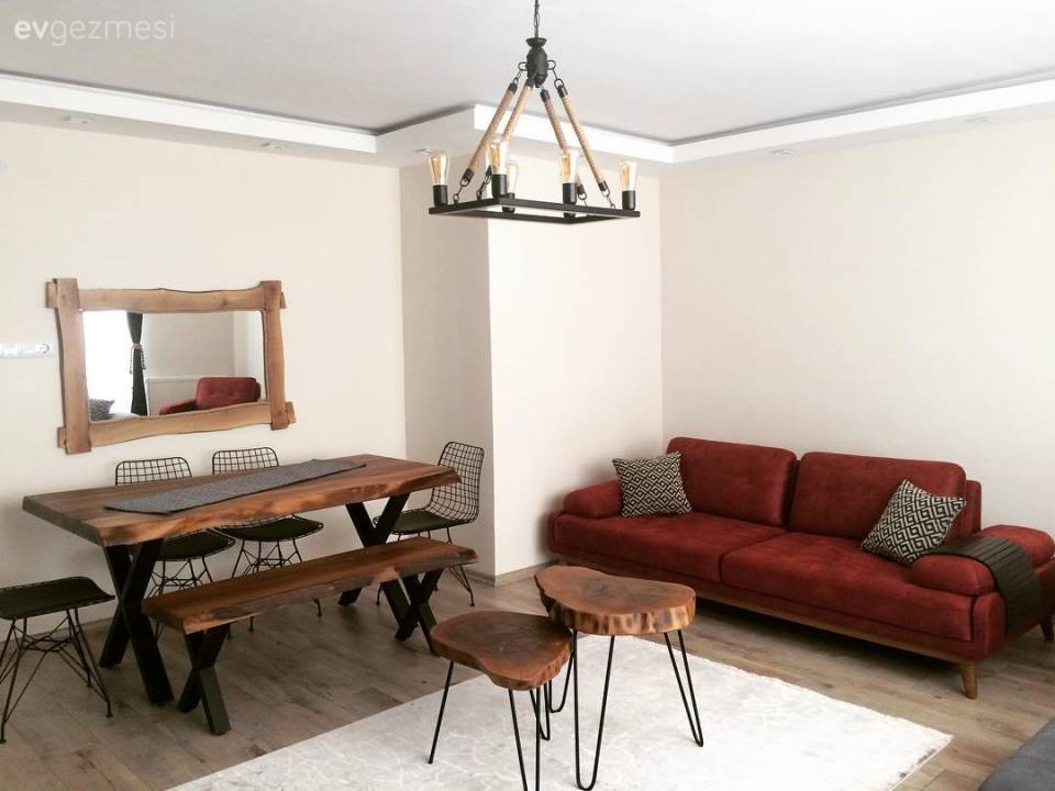 Evde alan çok geniş değil; akıllıcı seçimler sıkışık bir alan hissini engellemiş, oldukça ferah bir ortam yakalanmış. Salonda mavinin sıcak bir alt tonu, krem ve toprak tonlar ile beraber.. Yemek masası duvarında asılan tablodan, vazo içinde kuru çiçeklere uyum her aksesuarda ön planda. Simetrik yerleştirilen koltukların yanında nişler kullanılmış. Büyük mobilyalarla alan boğulmamış; orta sehpa yok, tv için ayrı bir sehpa yerine yemek masası konsolu değerlendirilmiş.