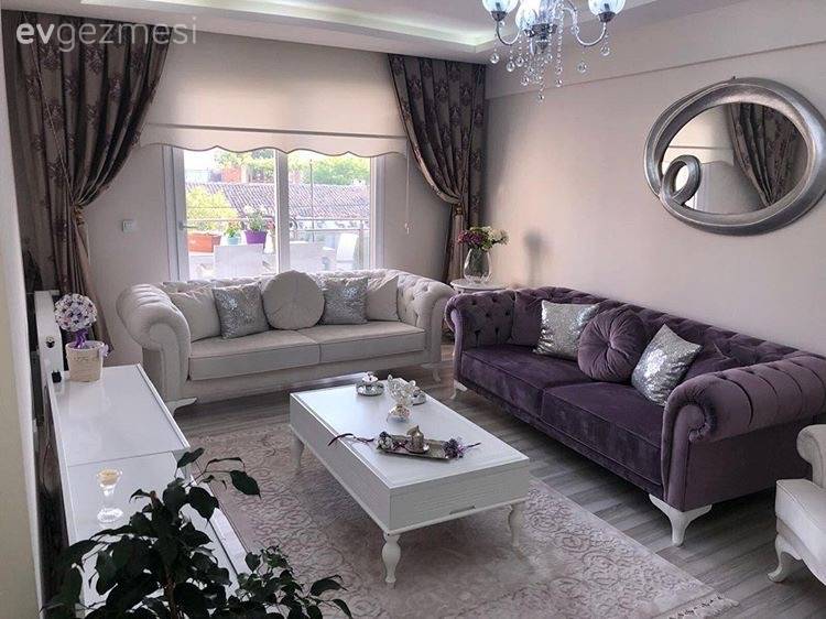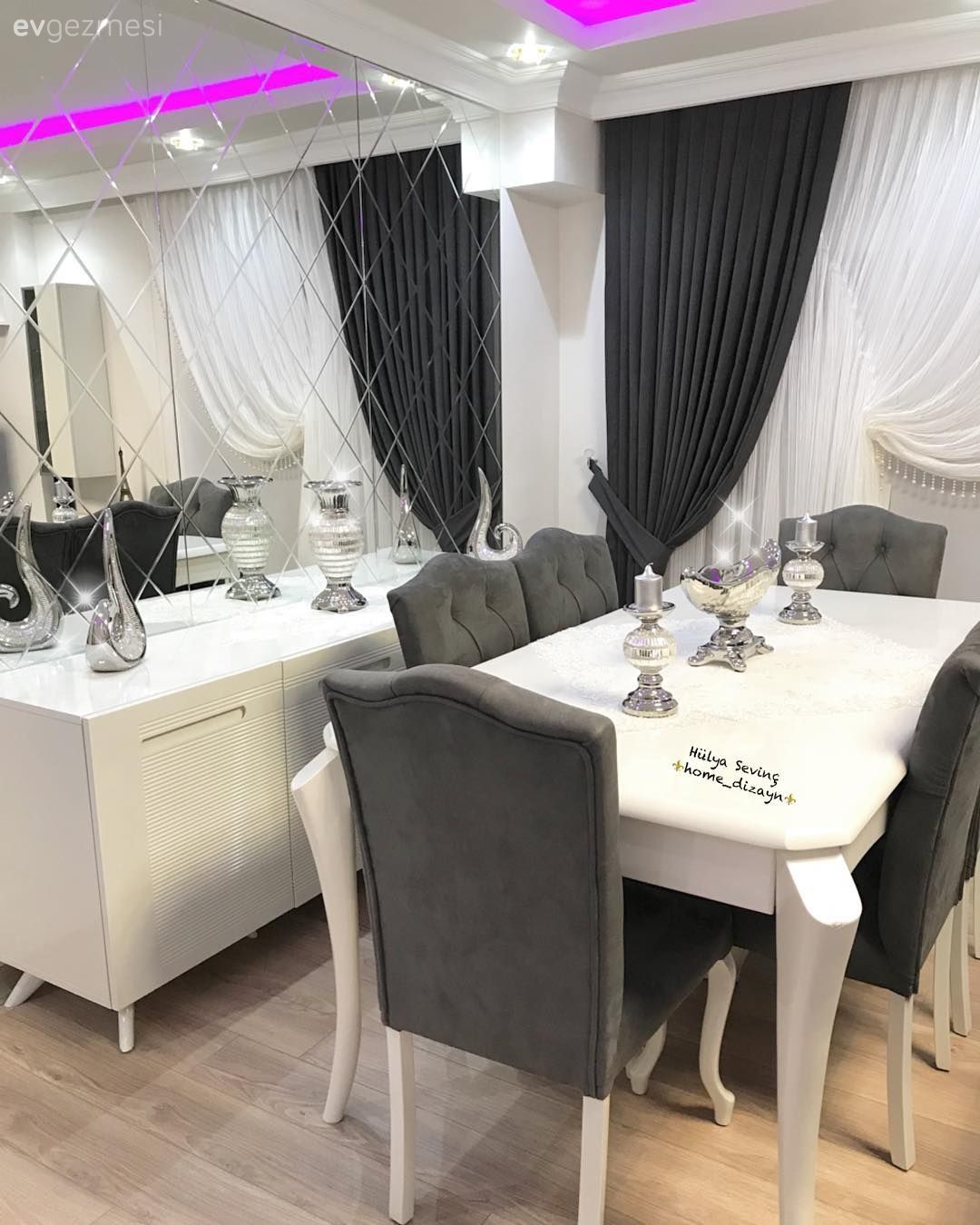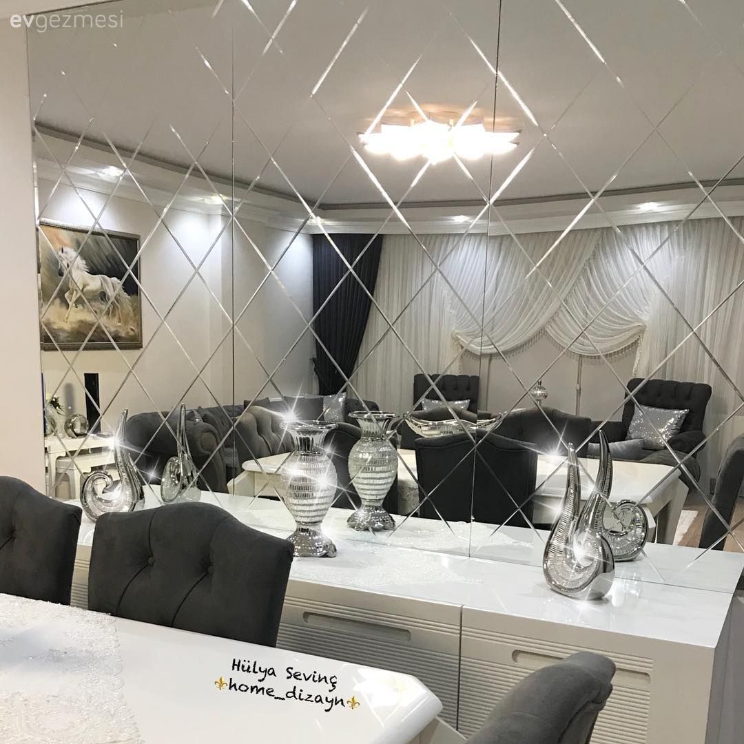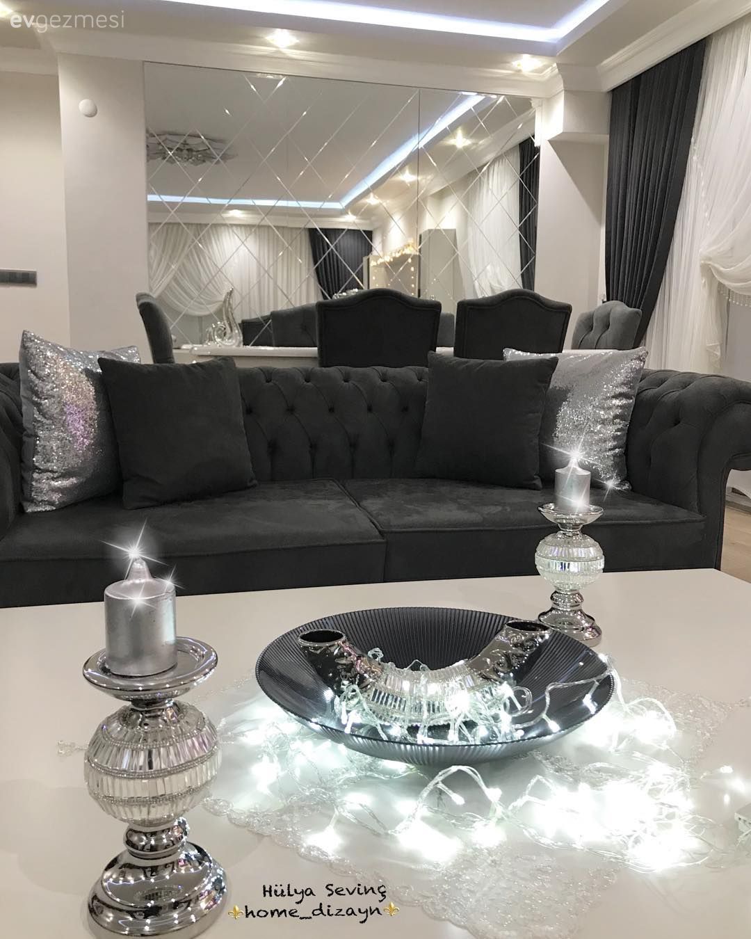 Füme gri ve beyaz uyumunu grinin en şık hali gümüş aksesuarlar ve büyük boyutlu aynalarla tamamlayan Hülya hanımın salonuna tekrar konuk oluyoruz..