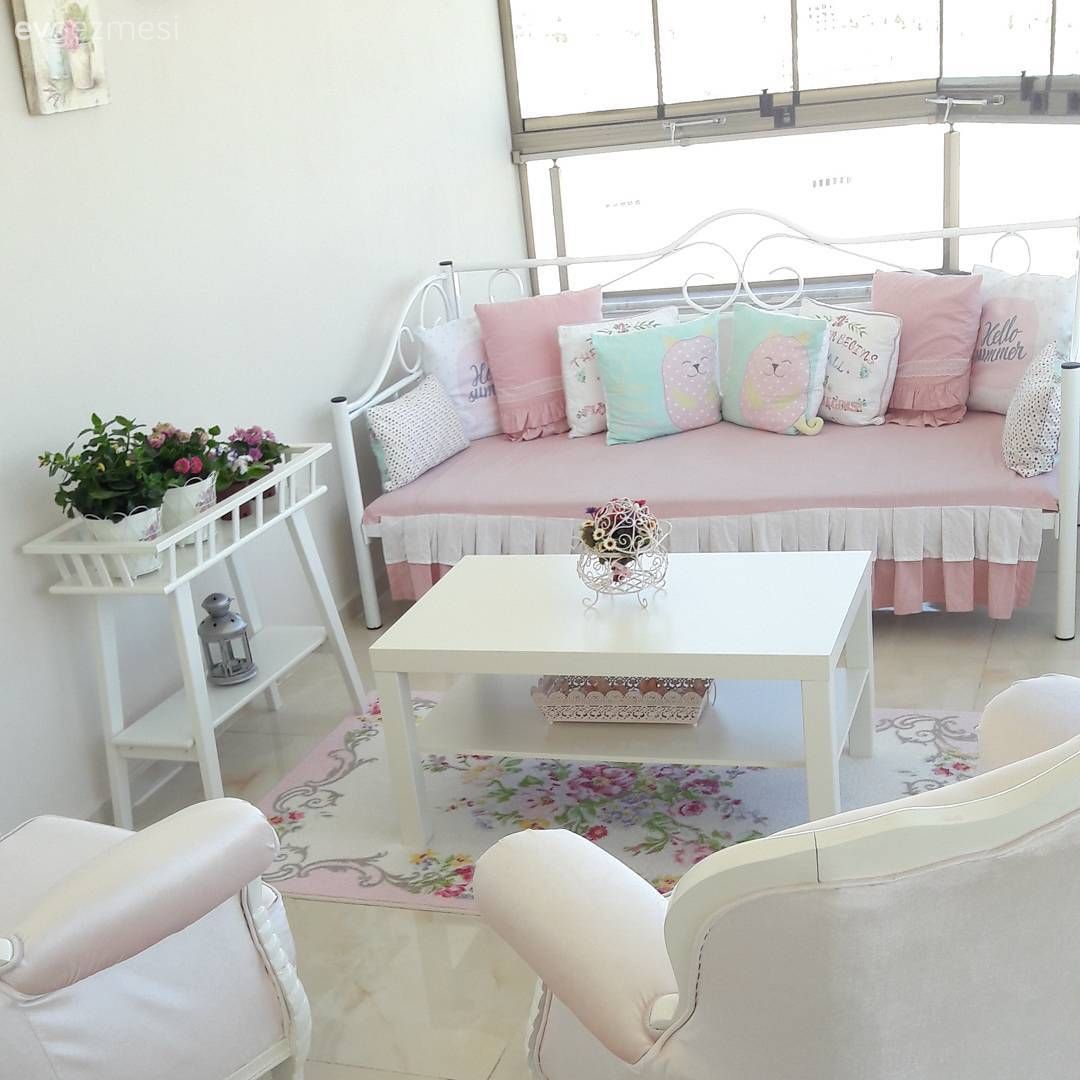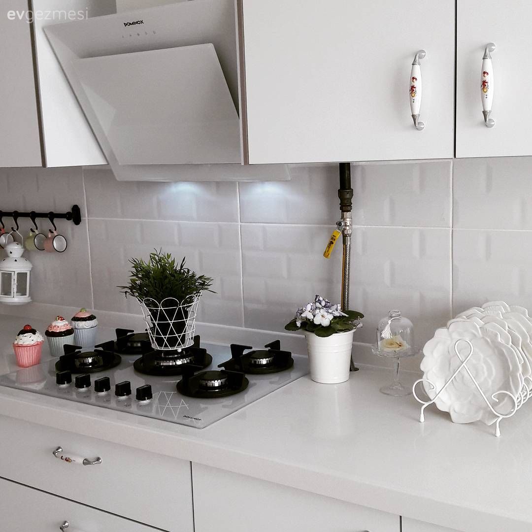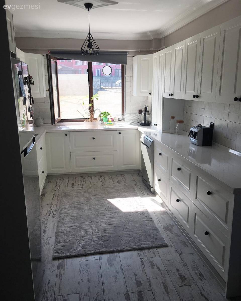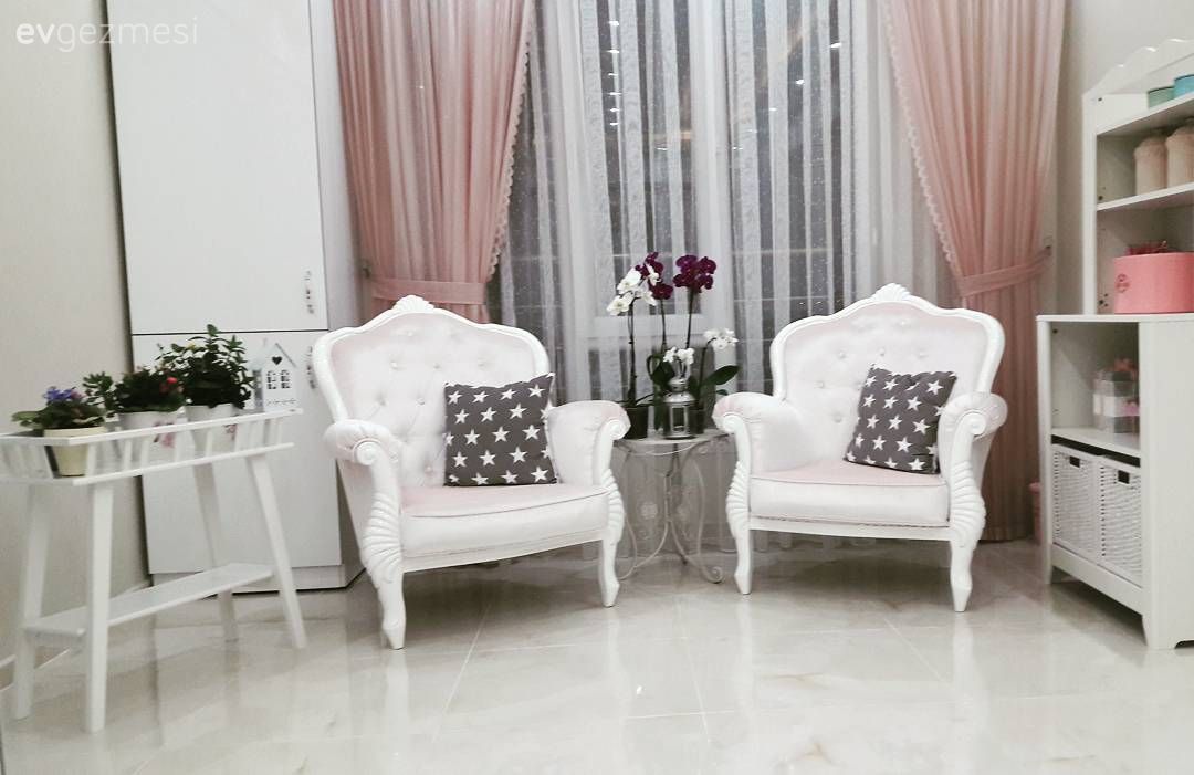 Mutfak yine oldukça geniş. Beyaz renk ise geniş alana daha da havadar ve hafif bir görünüm kazandırmış. Feyza hanım burada bir keyif köşesi oluşturmuş.. Eski berjerler pudra pembe renkte yenilenerek cam önünde keyifli bir kahve köşesi olarak kullanılıyor.