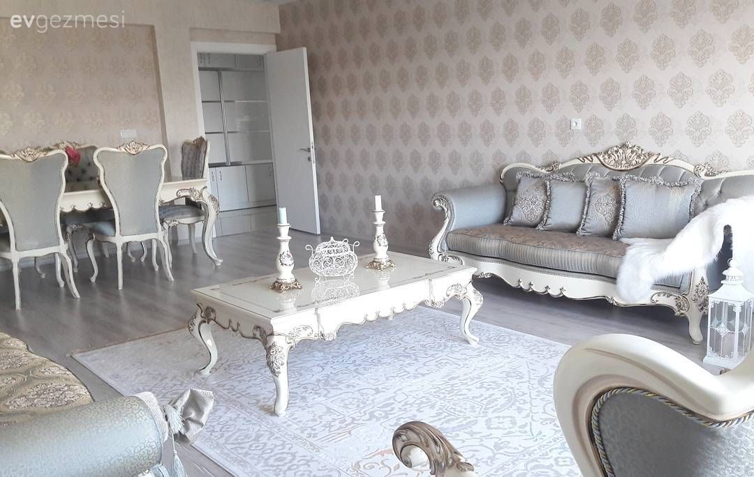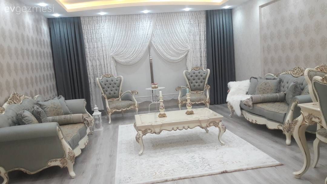 Salonda serin tonlar hakim.. Klasik stil mobilyaların şıklığı renk seçimleriyle sakin bir hava kazanmış. Duvar kağıtları, perdeler ve aksesuarlar mobilyaların şıklığına uyum sağlar şekilde seçilmiş.