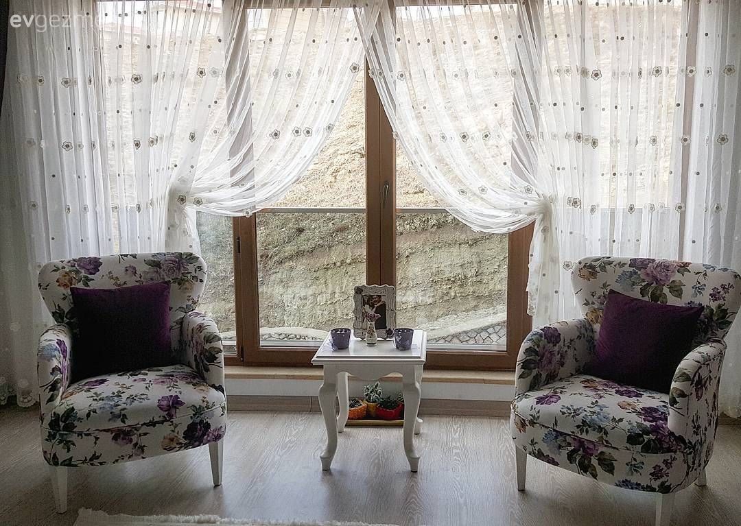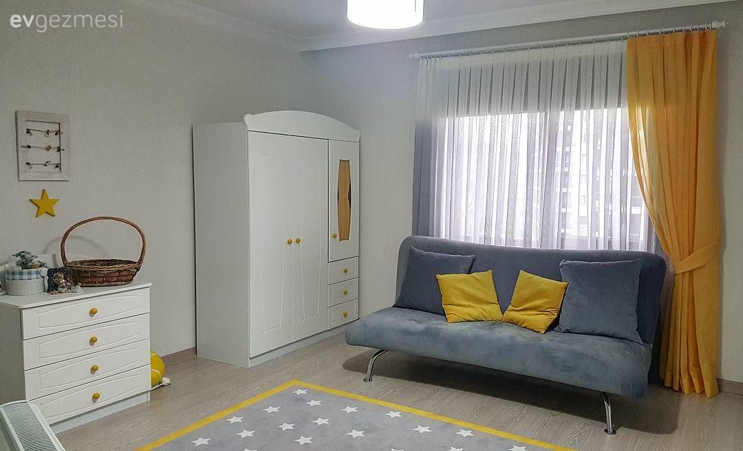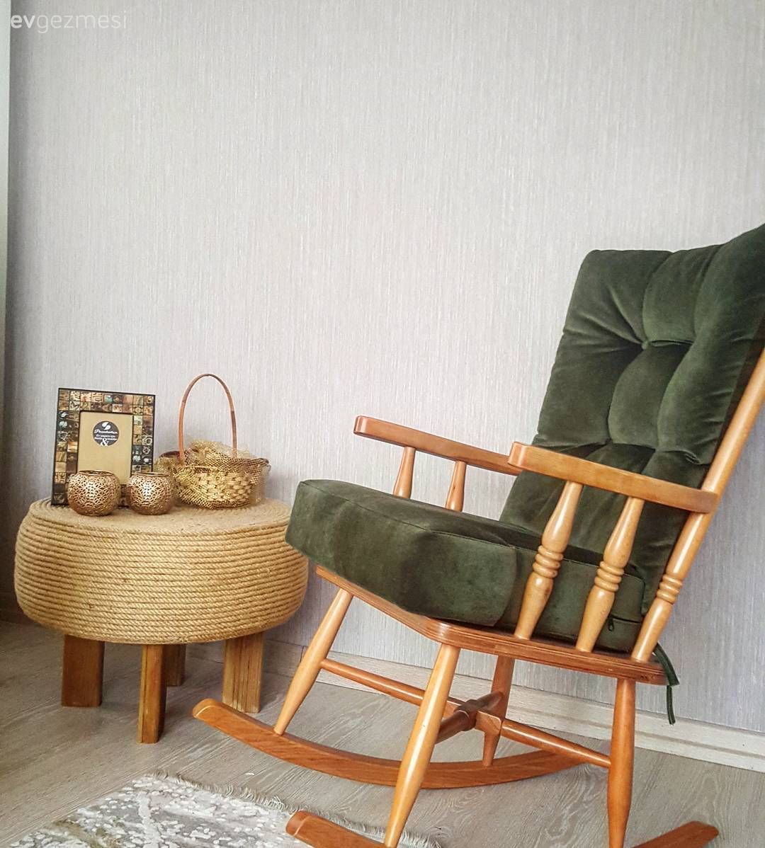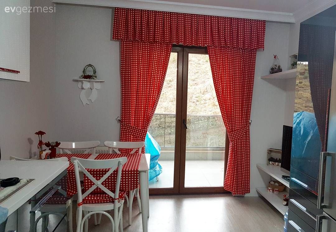 Salon ve yatak odası mobilyaları country stilde; oturma odasında ise sarı modern köşe koltuk alana canlılık katıyor. Sallanan sandalye dekora nostaljik bir dokunuş, çok da keyifli bir görünüm katıyor. Ev sahibimiz sandalye yanında halat satılmış bir puf ve üzerinde zevkli aksesuarlar kullanmış. Modern mutfak ise kırmızı kareli masa örtüsü ve perde ile yine rustik/ country esintiler taşıyor.