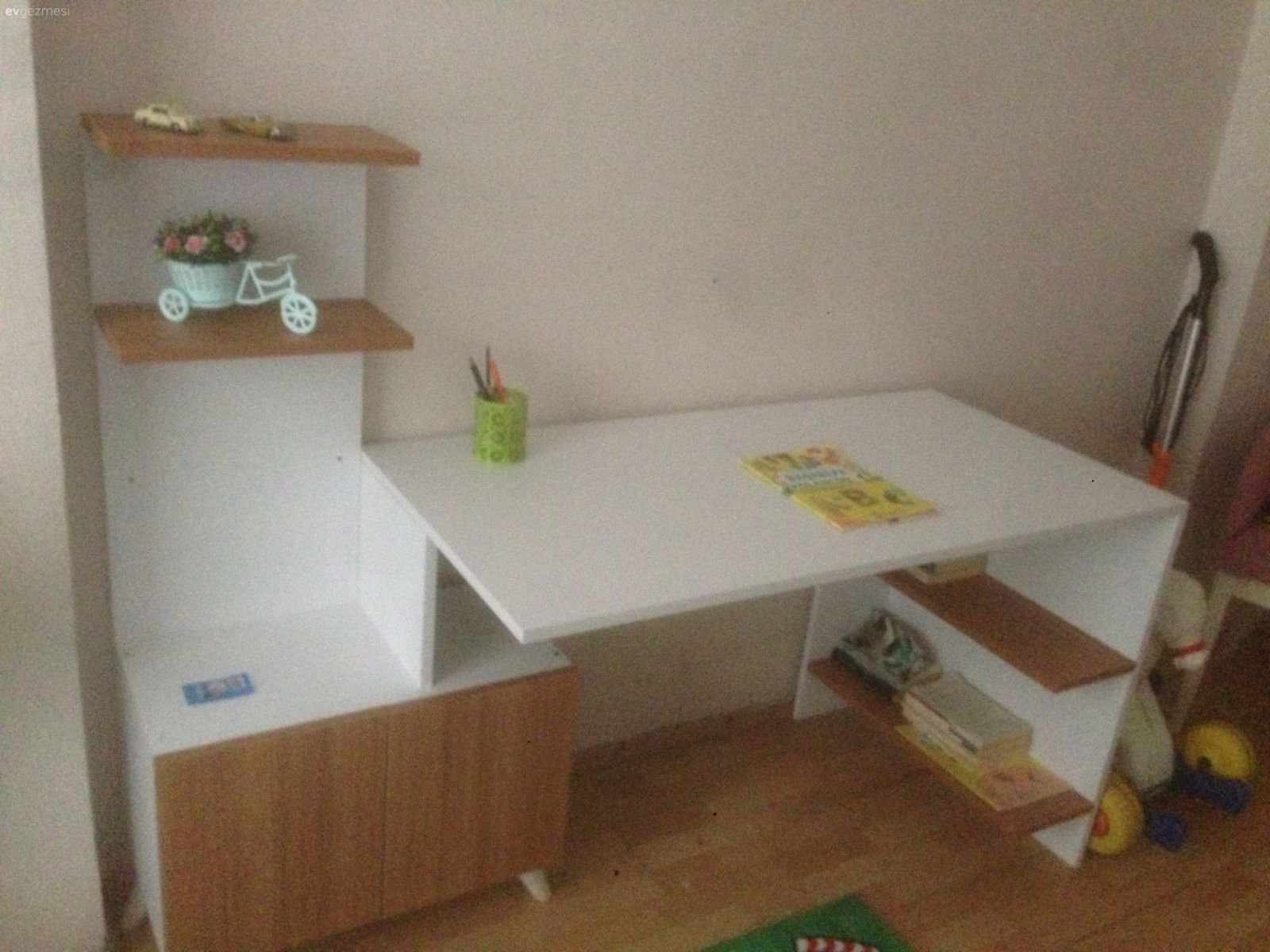 bence eksikleriniz tamamlanıyo Pınar hanım zamanla yavaş yavaş ve güzel hale geliyo ? bence en üste dekoratif 3 lü raf alın derim hikaye kitaplarını ve çerçeve koyabilirsiniz çalışma masası modern kesim olduğu için yakışır ikeayıda takip edebilirsiniz bazen sandelyeler geliyo çok hoş