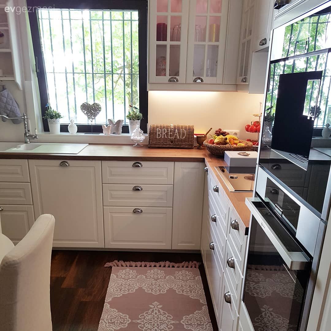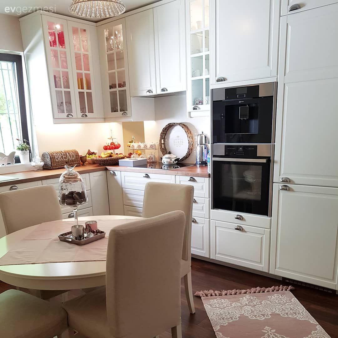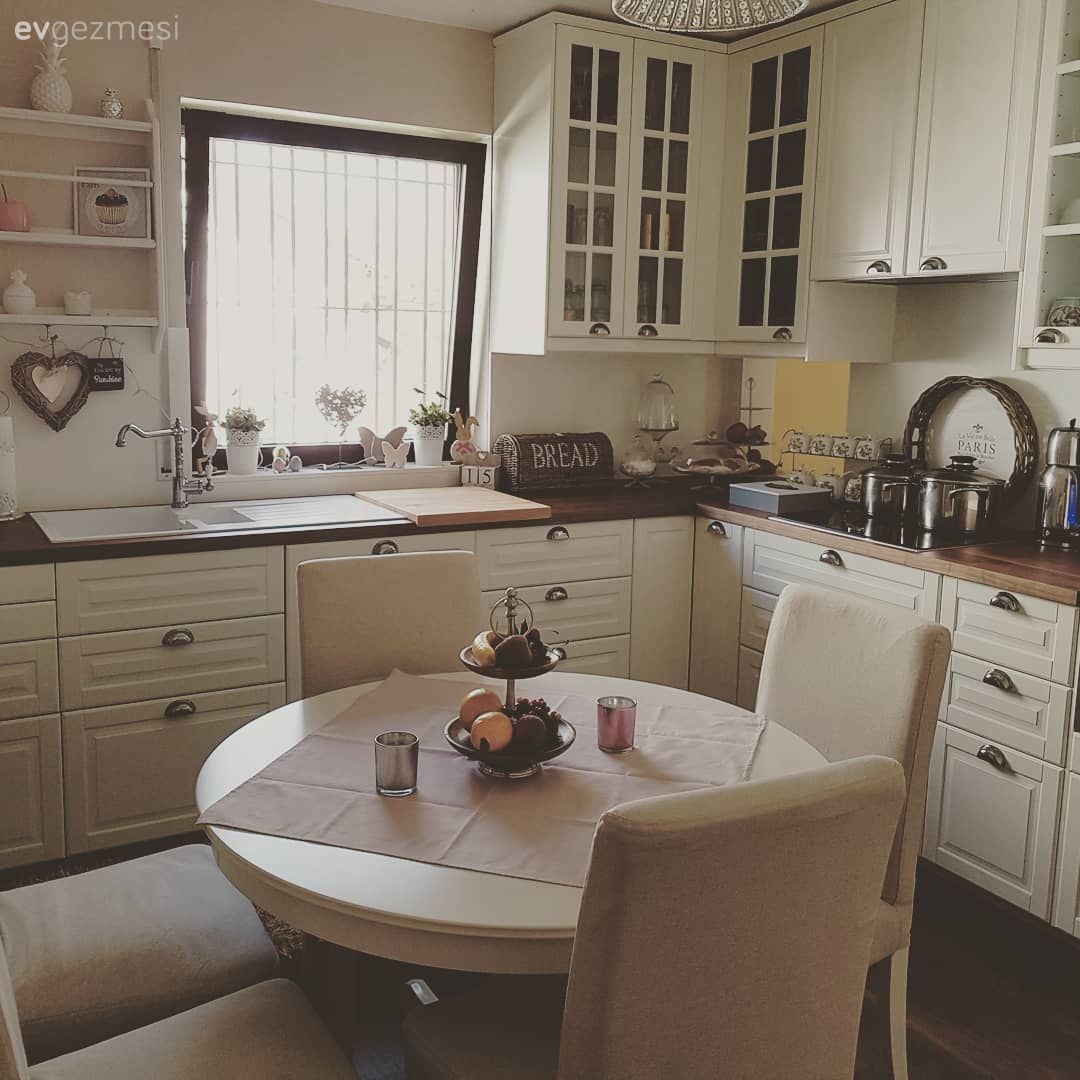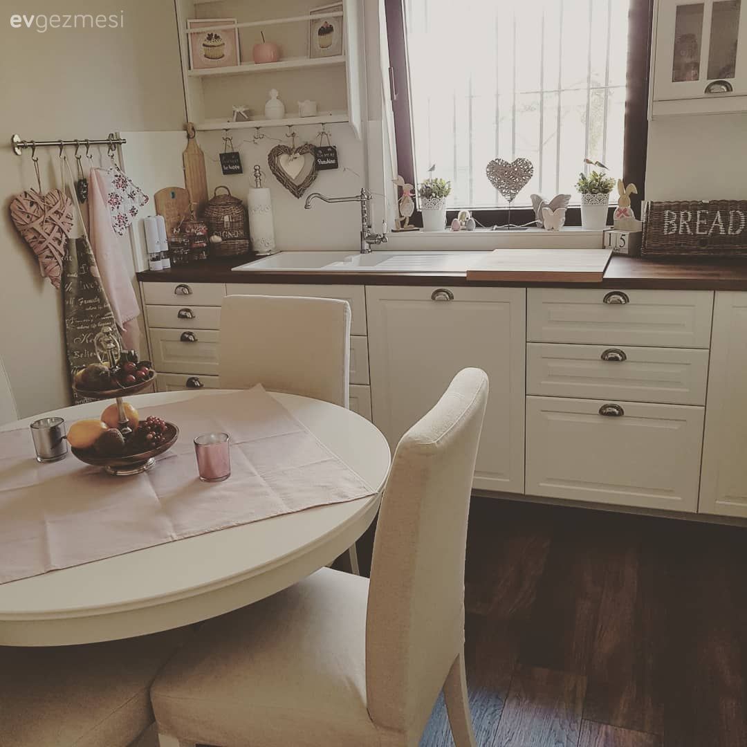 Country ve geleneksel stillerin açık renklerle tercih edildiği kapaklar, alanın imzası ahşap tezgah ile tamamlanmış. Rustik kulplar, çiçek desenli tekstil ürünleri ve terek gibi detaylar alanın sıcak hissini tamamlıyor. Bu mutfak sadece yemeklerin pişirildiği değil, servis edildiği de bir alan. Hemen ortaya yerleştirilmiş yuvarlak masa da buna imkan sağlıyor. Buyrun konuk olalım..