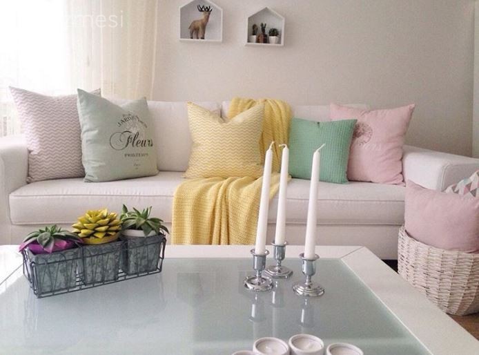 Özenilerek severek dekore edilmiş ve çok güzel fakat göz yoruyor.Özellikle herşeyin açık renk olması tek düze bir görüntü oluşturmuş. En azından koltuklar pembe ve halı düz renk olsaymış daha iyi olabilirmiş.