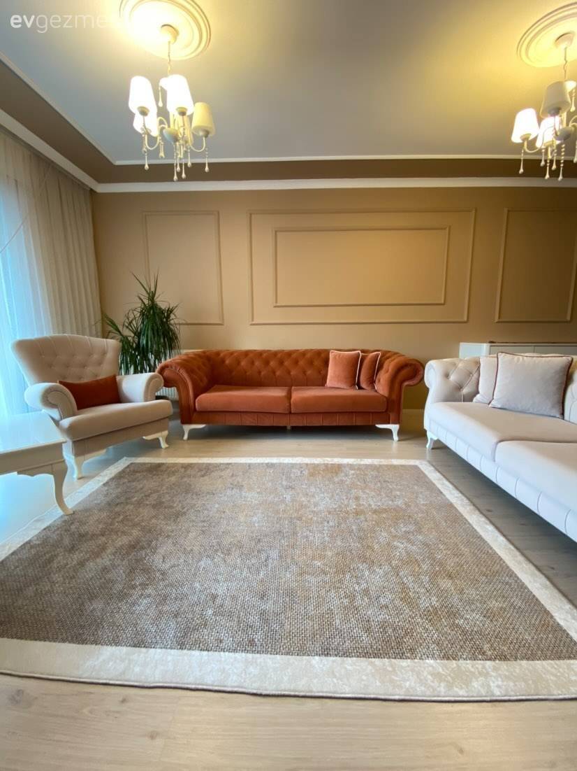 Koyu renkli parke, Oturma Odası, Halı, Parke, Pembe, Berjer, Perde, Krem, Fon perde, Avize
