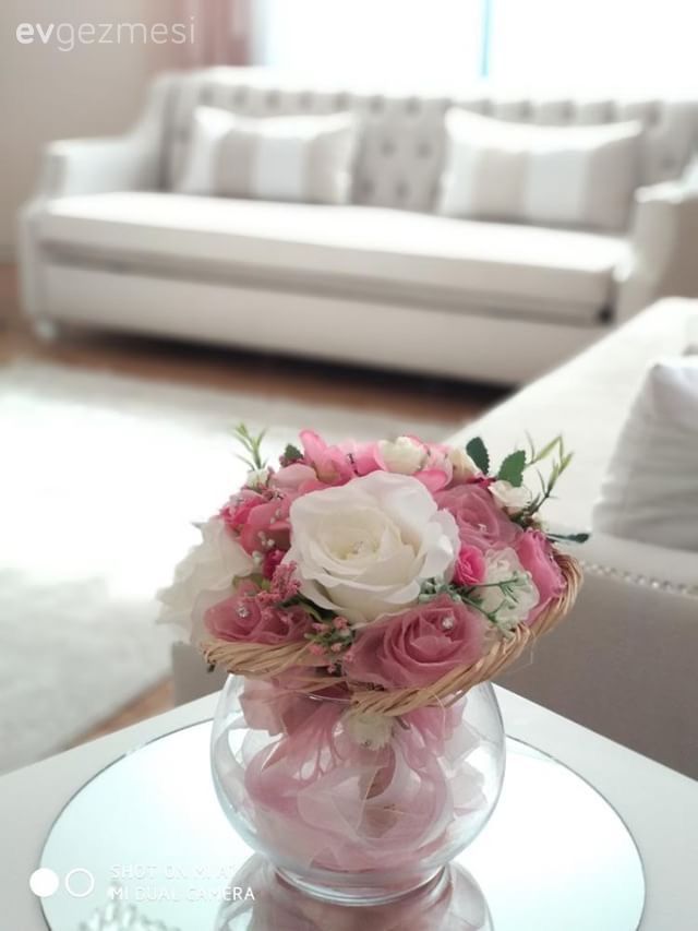 Bu yumuşak renk paleti krem koltuklar ve pembe kruvaze tüllerde büyük alanda kendini gösteriyor. Aslı hanım bu renkler arasında göz yormayan geçişler yapmak istemiş. Aralara ufak tefek pembe aksesuarlar ve bu tatlı buketi eklemiş. Işıltıları, aydınlık ve parlak şeyleri de seviyor ev sahibimiz. Ayna supla, taşlı lambader ve jardinyer kullanarak bu etkiyi salona getirmiş.