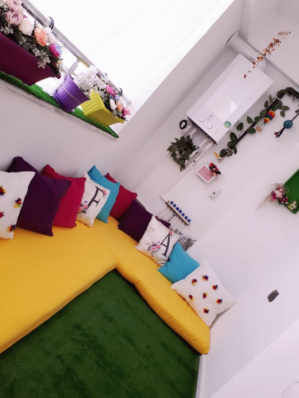 Mavi ve beyaz olarak seçtiği ana renklerinin huzur veren etkisini, eğlenceli detaylar ekleyerek biraz da neşelendirmek, mutlu bir atmosfere büründürmek istemiş ev sahibimiz. Salonda tavana monte örgü salıncak tam da dediğimiz gibi bu dekorun oyuncu parçalarından biri, çok da tatlı bir seçim. Salonda duvar dekoru olarak ise 3 pano kullanımda; bu panolar salonun renklerine uyumlular, baharda çiçek açan dal desenleriyle dekora canlılık katıyorlar.