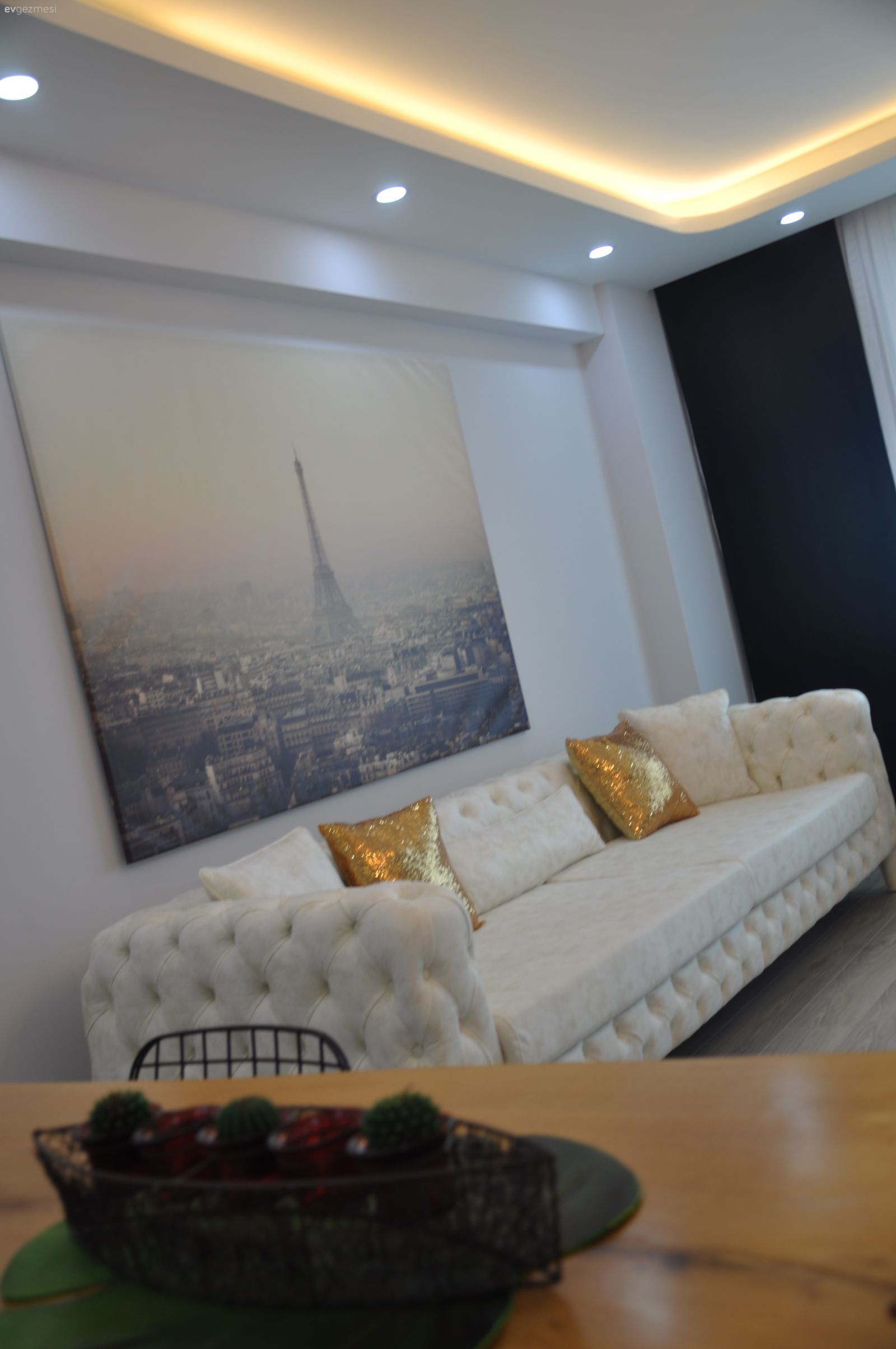 Begüm hanımın koltuk takımı seçimi, salon dekorasyon stilinde belirleyici. Ev sahibimiz klasiği seviyor; ama klasiğe modern bir çehre katmak istiyor. Dekorda abartısız sade parçalara da, göz alıcı dokunuşlara da yer var. Bu haliyle de dengeli bir ortam yakalanmış.