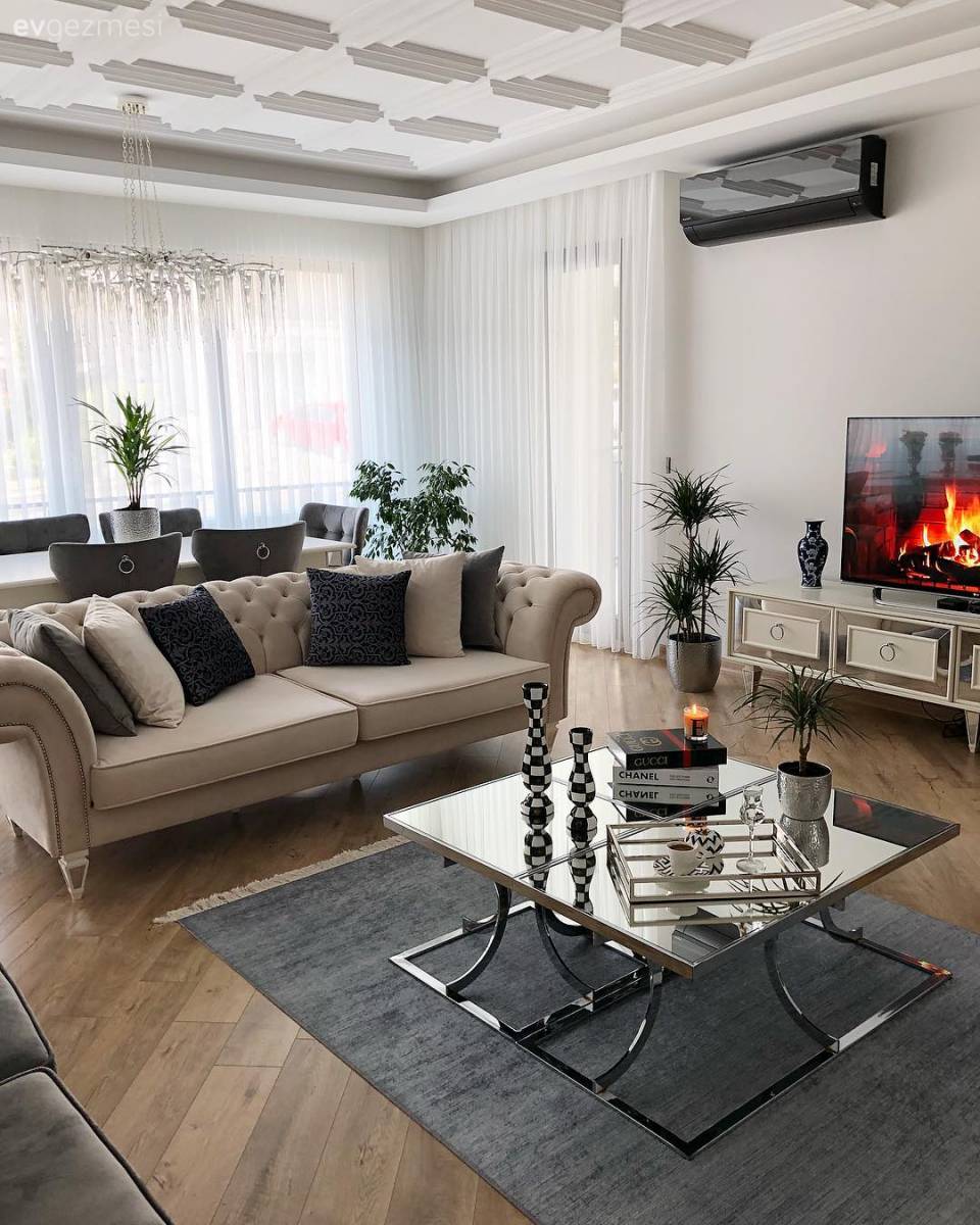 "Konfor ve rahatlık önemli, ama ev dediğin biraz da şık olmalı" diye düşünerek evini tasarlamış Nihal hanım. Salonda açık renklerin hakimiyeti, alana havadar, hafif bir his katmış. Beyaz mobilyalar ayna detaylara sahip. Koltuk takımı olarak ise modern bir chesterfield takım tercih edilmiş. Yemek masası sandalyeleri koltuk takımına uygun renk ve stilde. Alanı küçültmemek adına uygun boyutta kullanılmış konsol, üzerinde şık aynasıyla dekoru zenginleştiren bir seçim.