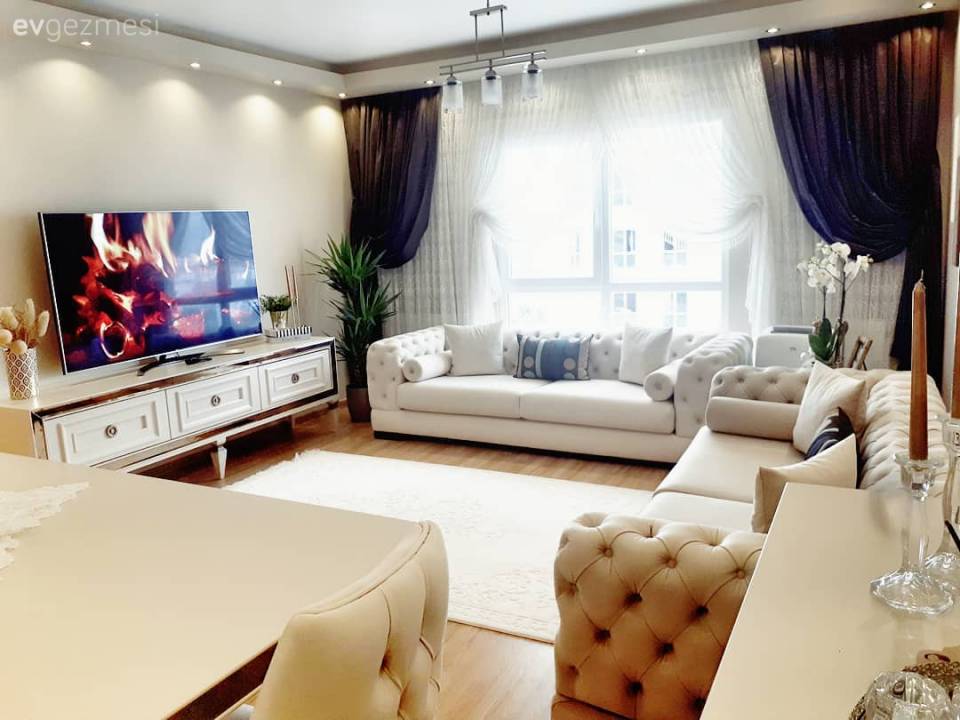 Perdeler bence koltuğunuzun yeşili veya koyu kahverengi olabilir. Ev süperto. Özellikle de süpürgelikleri böyle çok seviyorum ben. Güle güle oturun