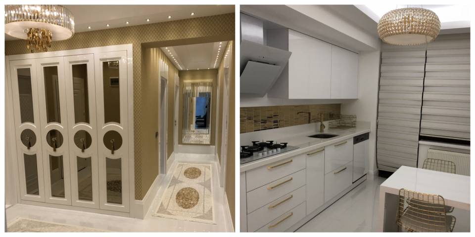 Banyo ve mutfak klasik tasarımlara sahip. Siyah, beyaz ana renkler, bu klasik dokunuşu tamamlayan altın detaylarla şıklık kazanıyor.